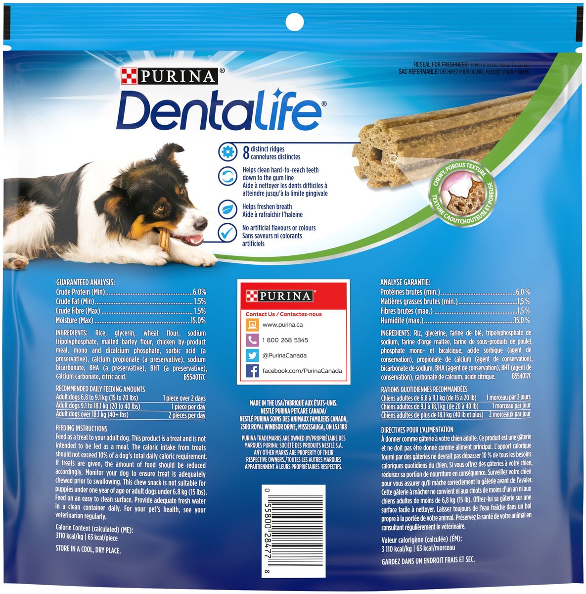 These dental treats have ridges and a chewy texture that helps aid in cleaning the teeth, in even the hard to reach places. It also contains ingredients that help freshen their breath.