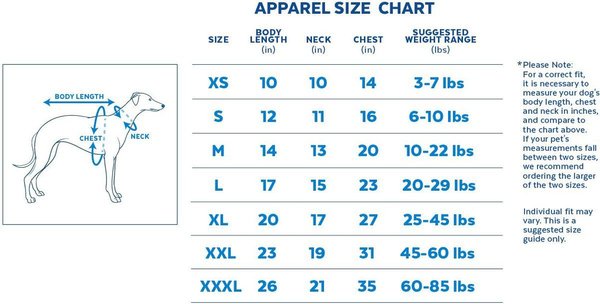 | Size | Body Length (inches / cm) | Neck (inches / cm) | Chest (inches / cm) | Suggested Weight Range (lbs / kg) |