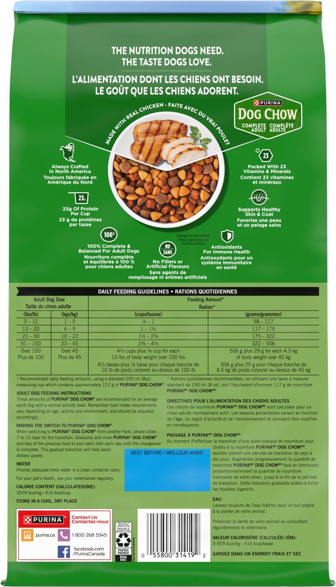 These amounts of Purina Dog Chow Brand Dog Food Complete Adult are recommended for an average adult dog with a normal activity level. Remember food intake requirements vary depending on age, activity and environment, and should be adjusted accordingly.