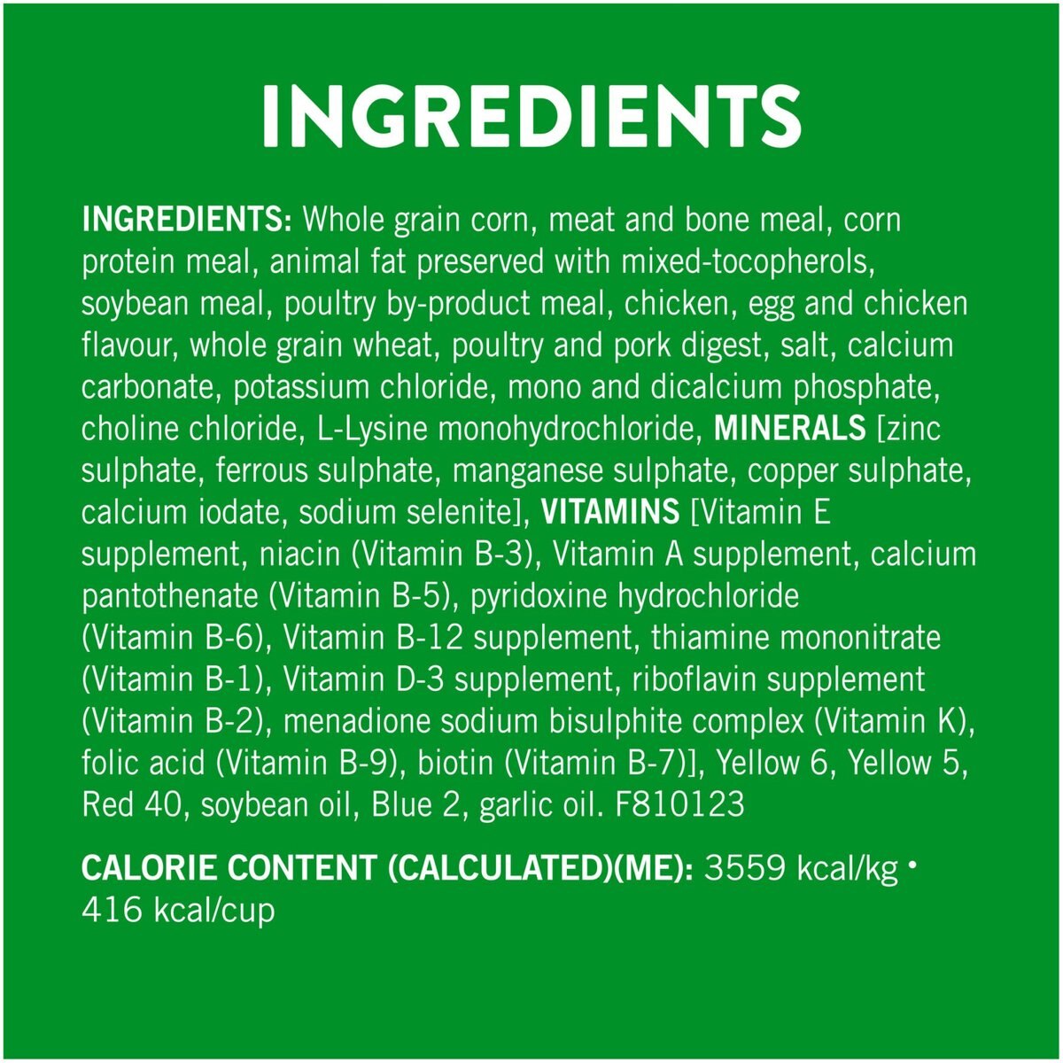 Whole Grain Corn, Meat and Bone Meal, Corn Protein Meal, Animal Fat Preserved with Mixed-Tocopherols, Soybean Meal, Poultry By-Product Meal, Chicken, Egg and Chicken Flavour, Whole Grain Wheat, Poultry and Pork Digest, Salt, Calcium Carbonate, Potassium Chloride, Mono and Dicalcium Phosphate, Choline Chloride, L-Lysine Monohydrochloride, Minerals [Zinc Sulphate, Ferrous Sulphate, Manganese Sulphate, Copper Sulphate, Calcium Iodate, Sodium Selenite], Vitamins [Vitamin E Supplement, Niacin (Vitamin B-3), Vitamin A Supplement, Calcium Pantothenate (Vitamin B-5), Pyridoxine Hydrochloride (Vitamin B-6), Vitamin B-12 Supplement, Thiamine Mononitrate (Vitamin B-1), Vitamin D-3 Supplement, Riboflavin Supplement (Vitamin B-2), Menadione Sodium Bisulphite Complex (Vitamin K), Folic Acid (Vitamin B-9), Biotin (Vitamin B-7)], Yellow 6, Yellow 5, Red 40, Soybean Oil, Blue 2, Garlic Oil.