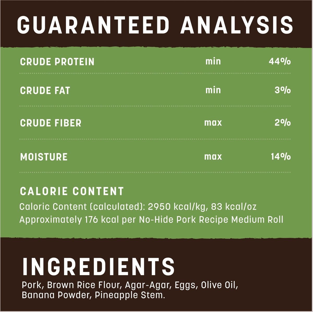 Pork, Brown Rice Flour, Agar-Agar, Eggs, Olive Oil, Banana Powder, Pineapple Stem.