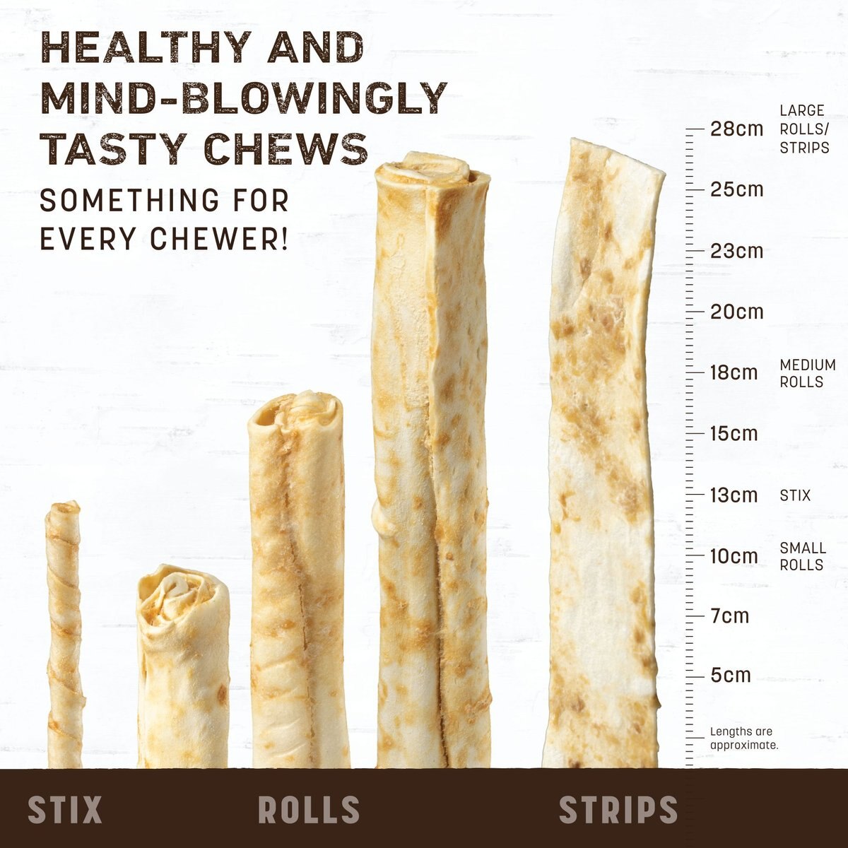 These treats are made from natural ingredients and do not contain plastic. They are designed as a safer and more digestible alternative to traditional rawhide, and the treats are typically made from ingredients like chicken, pork, or plant-based items, depending on the specific recipe.