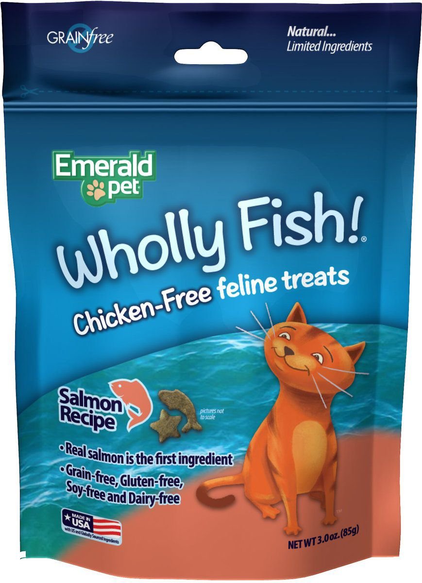 - Purr-fect for cats with sensitive stomachs, Wholly Fish! treats are made without chicken or fishmeal.