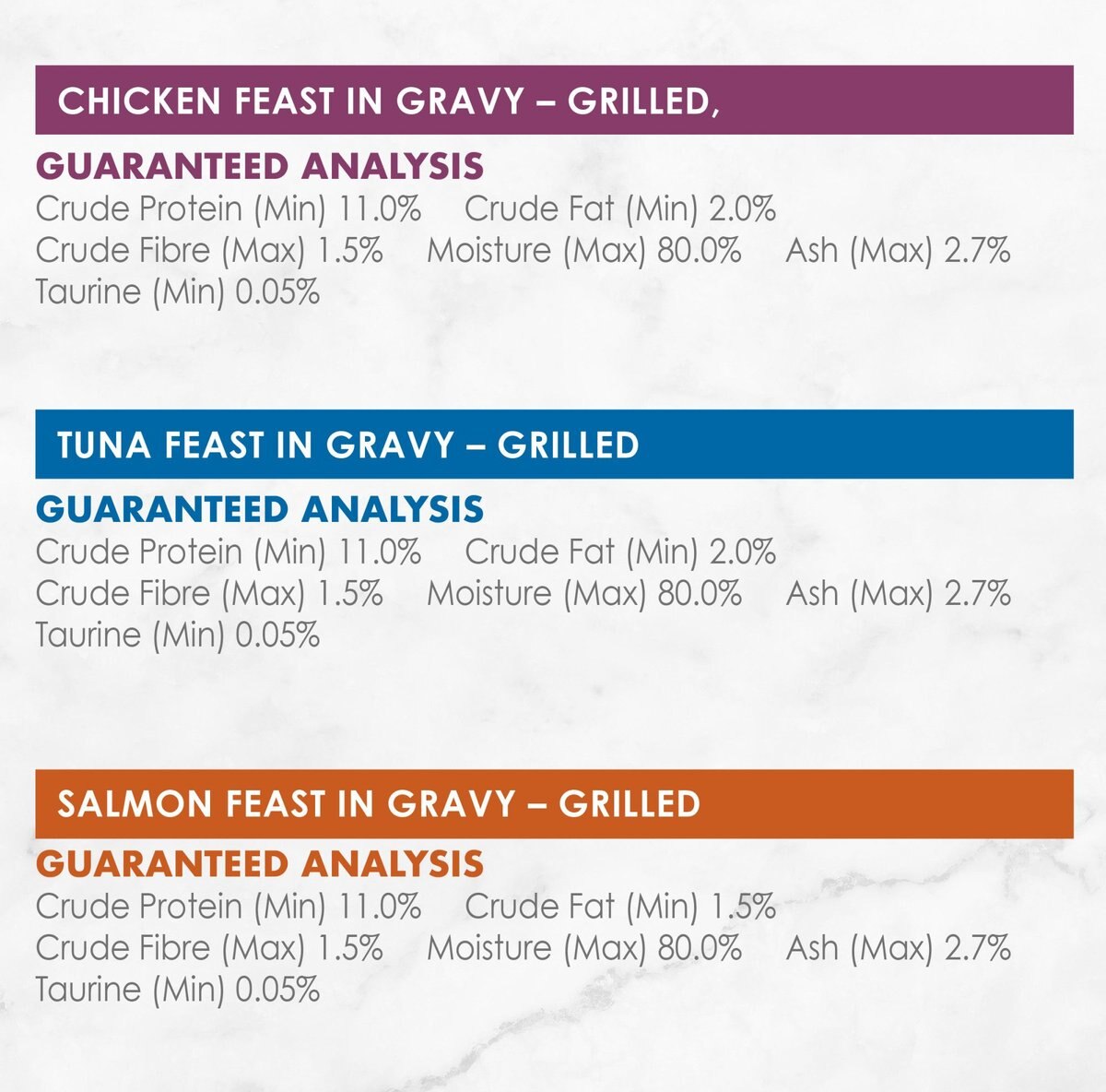 Salmon Feast: Fish Broth, Salmon, Wheat Gluten, Chicken, Meat By-Products, Liver, Corn Starch-Modified, Soy Flour, Glycine, Salt, Tricalcium Phosphate, Minerals, Natural Flavour, Taurine, Choline Chloride, Vitamins. E692622.