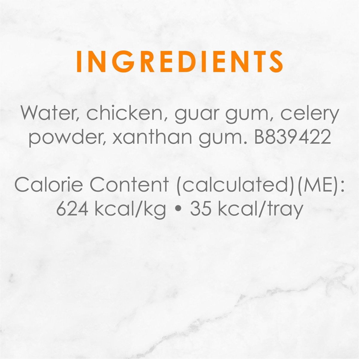 This recipe has a calorie content of 20 kilocalories per tray (kcal/tray), or 643 kilocalories per kilogram (kcal/kg).