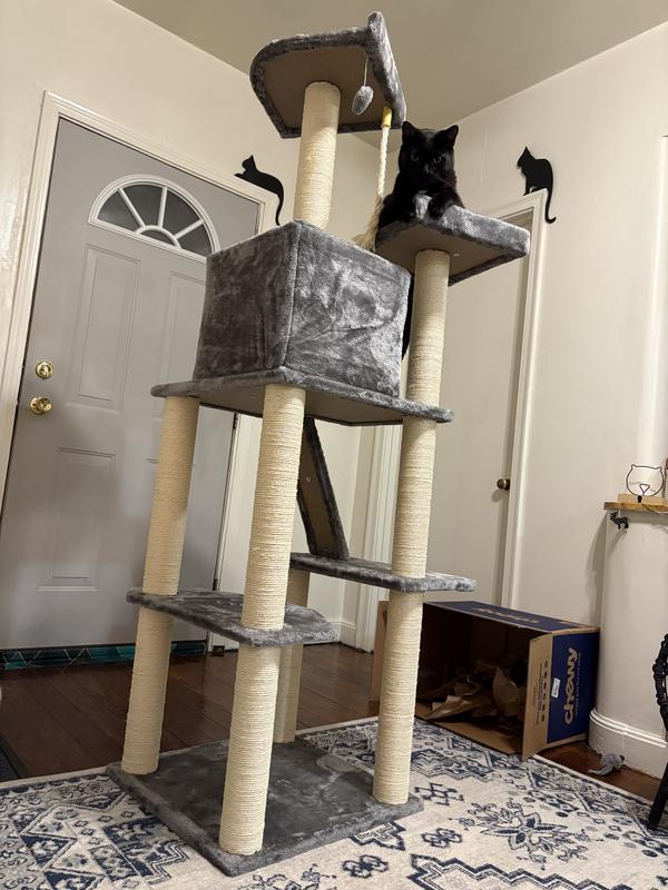• From Frisco by Chewy. All-in-one cat tree provides a safe hideout, fun toys, sisal scratching posts and ramp, and lookout perches at different heights for daily enrichment, play and exercise.