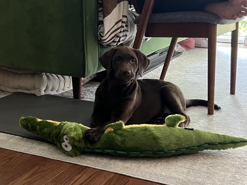 Astra immediately started playing with this alligator, and it is her new favorite toy. She plays with it every morning before I come downstairs to walk her. leaves it on guard in the front hallway when I take her for a walk. She just loves the two different squeaker noises.