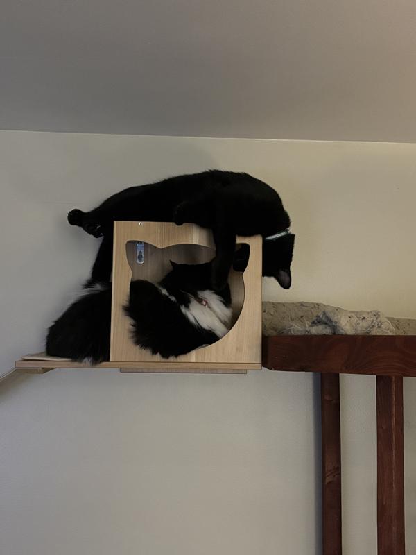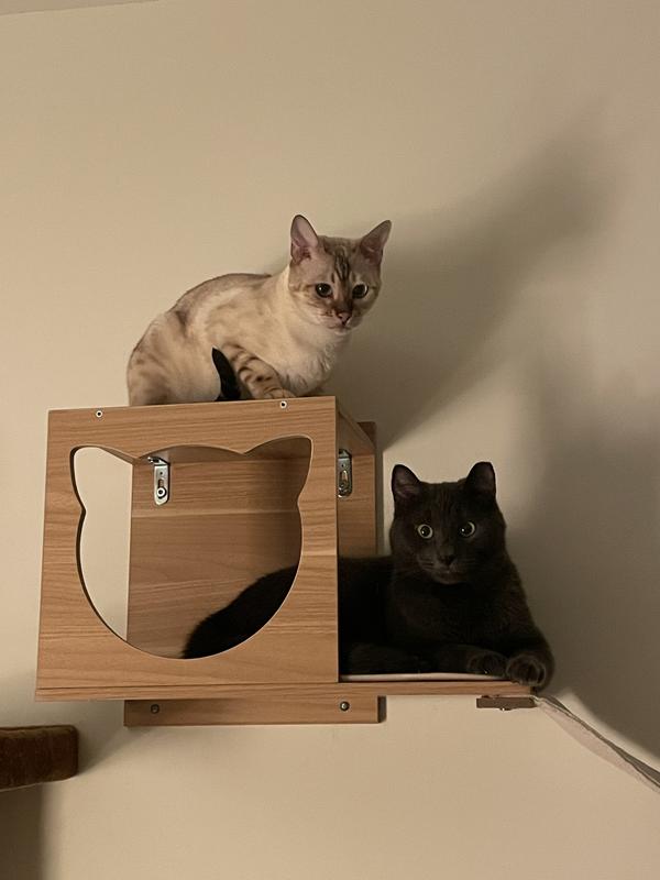 My cats love this thing! We had a task rabbit come and install it, took 20 minutes, and definitely holds up very well. Even two cats can sit on one shelf and it doesn’t wiggle. We put it up next to the top of our cat tree so they can easily walk onto it.