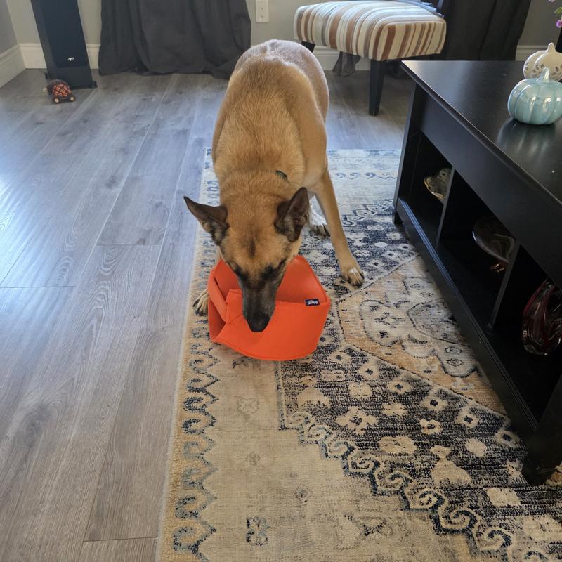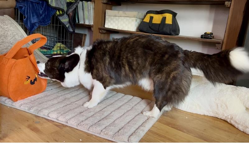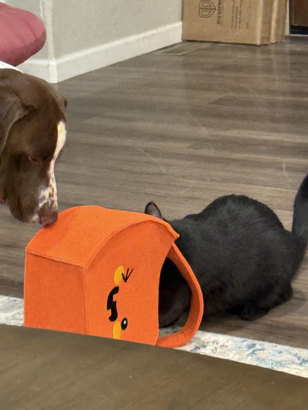 This was really enjoyed by both my dogs. They got to trick or treat by sticking their head in the bag and pulling out a toy. The fun lasted for 2 days, I could have