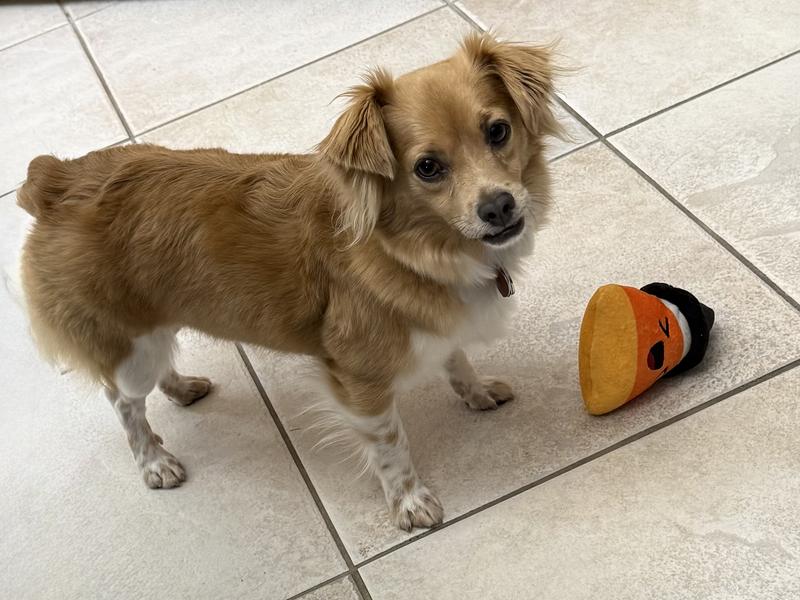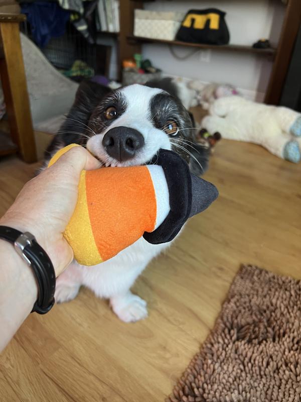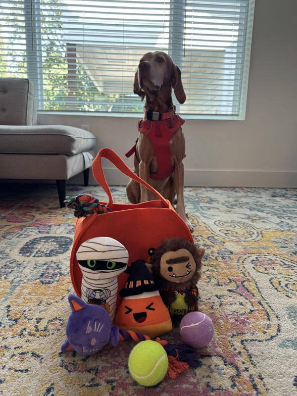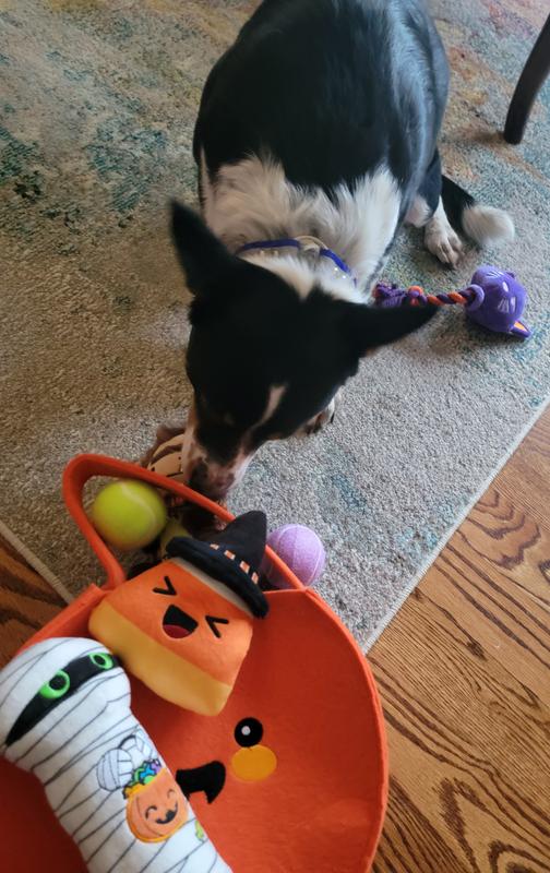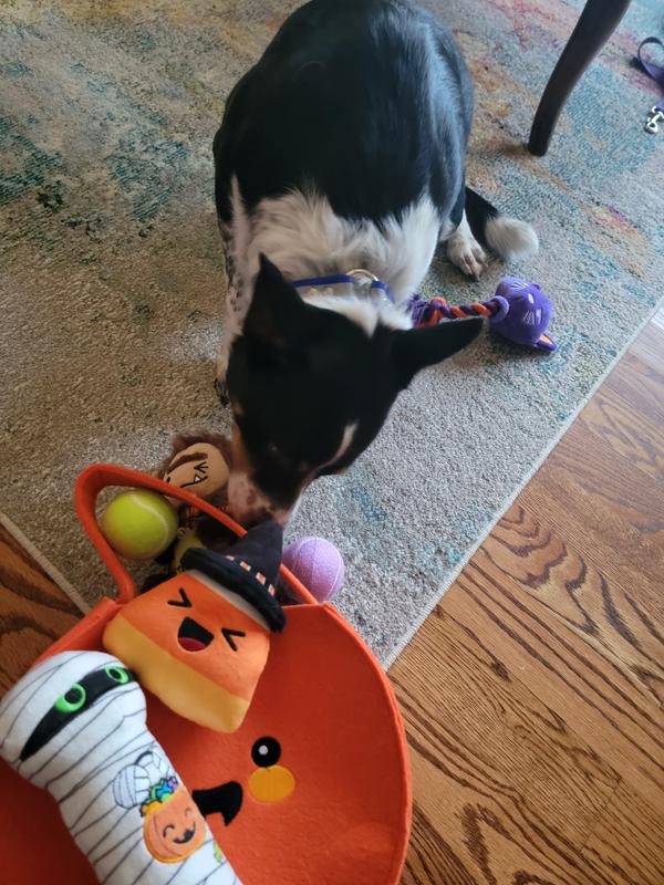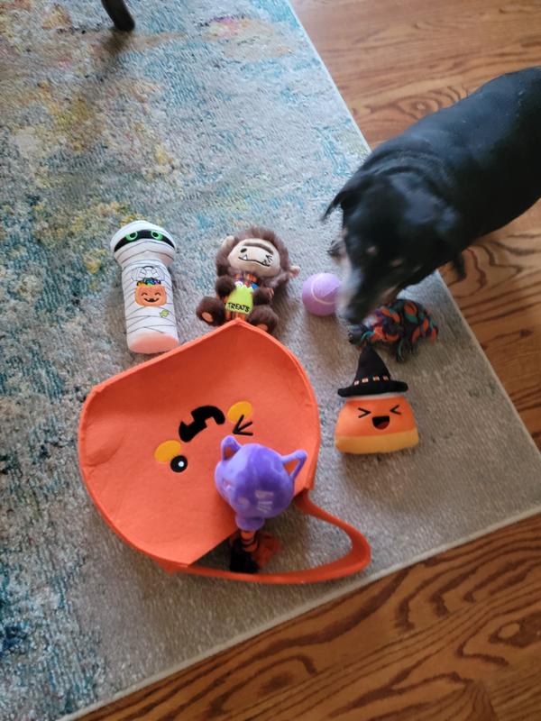 [This review was collected as part of a promotion.] Fun, fun, fun toys! My dog loves every single one of the large number of toys in this cute toy carrier! He is especially fond of the Candy Corn toy, and carries it with him everywhere. He also loves the Mummy toy that crinkles delightfully. When toy time is over, it is easy to store all the toys in the cute orange bag that is provided.