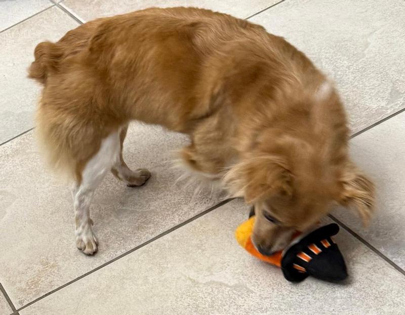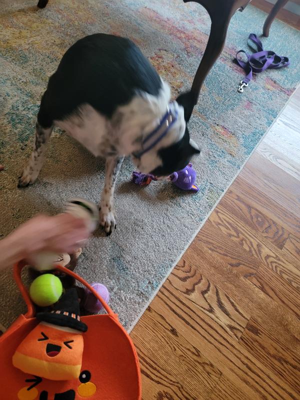 [This review was collected as part of a promotion.] Ted, our 30 lb standard Pomeranian, had to help open the Chewy box. He was growling and pawing at it trying to see what was inside! He stuck his head in tge Halloween bag and the handle was behind his neck and he couldn't pull a toy out lol. He would grab each of the 7 toys and run with them. We would make them squeak or crinkle and he would go crazy. It's a great basket of Halloween dog toys!!