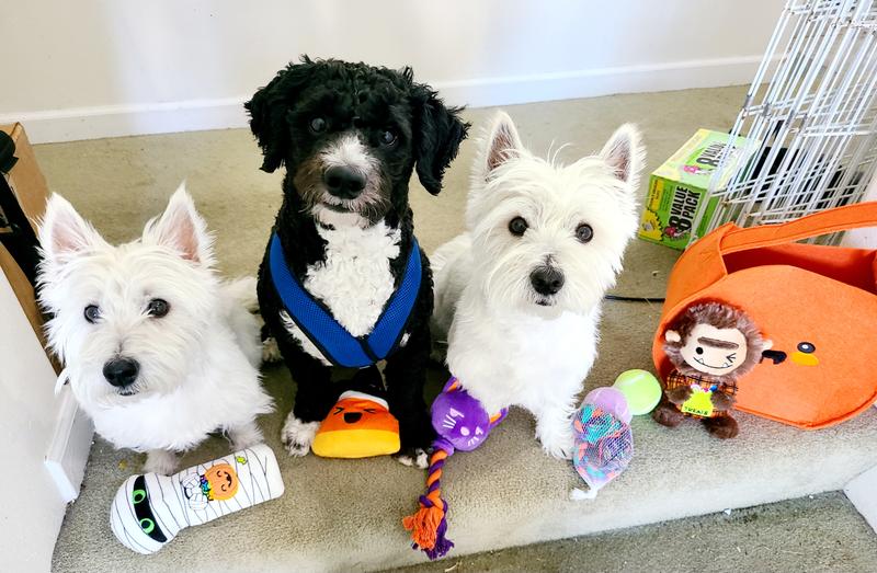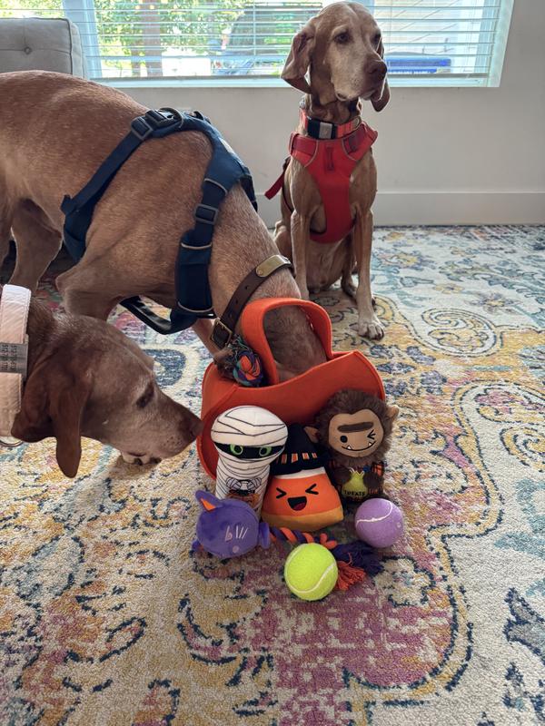 [This review was collected as part of a promotion.] My dogs absolutely love this basket of goodies!! There is so much variety in the toys included so each of my dogs were able to fully enjoy it. It included a little stuffy attached to a rope, water bottle stuffy, 2 tennis balls, a little rope, and regular stuffies too. Somehow my dogs have made the stuffy with the small rope attached their 3 way tug of war toy! How they do it, I will never understand lol. My dogs would barely let me set down the boo basket before tearing into the toys! I will say that this is not for hardcore chewers as they are soft toys. Mine are super chewers however it’s worth the carnage of the toys to see them this happy! Even my cat was having a blast playing in the little pumpkin basket. 1000% recommend for a spooky gift