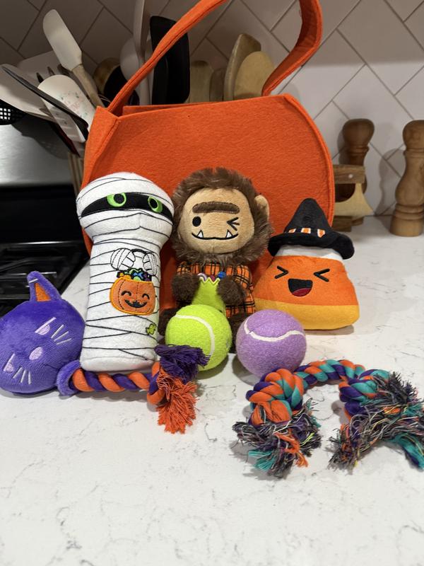 - Includes a rope toy; a plush-and-rope lollipop toy shaped like a cat; a squeaky, crunchy plush mummy with an interior plastic water bottle; a plush, squeaky werewolf; two squeaky tennis ball toys; and a plush, squeaky candy corn toy in a witch hat.