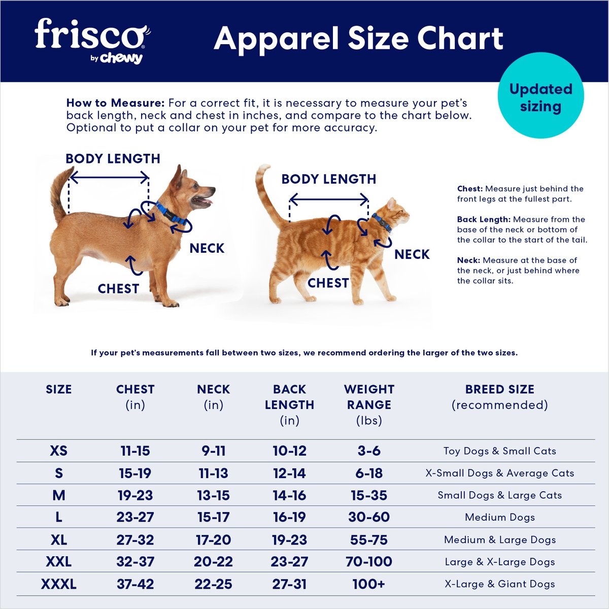 For the best fit, match the size dimensions to your pet's measurements as closely as possible. If your pet falls somewhere between two sizes, we advise ordering the larger of the two.