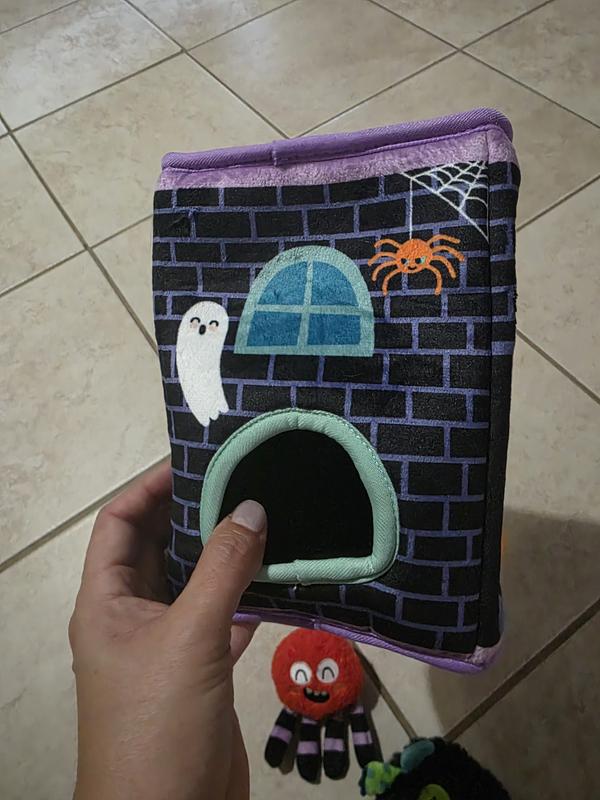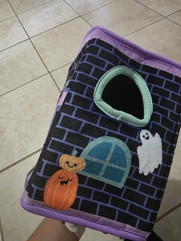 [This review was collected as part of a promotion.] This such a cute Halloween toy! Both my 2 small dogs and cat love it. It has 2 opening windows so the cat and stick his arm in and try to get the monsters out. Keeps them all entertained. Its soft and would be easy to store away.