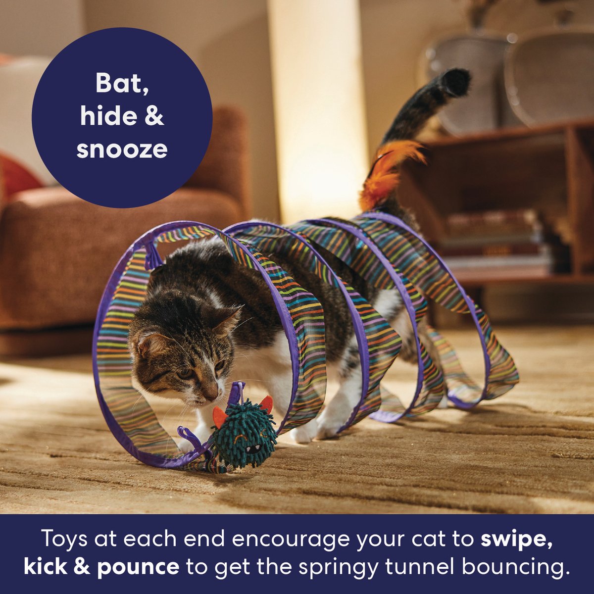 • This pop-up cat tunnel features a light, loopy frame for your cat to pounce on, lie in, run through, and kick at.