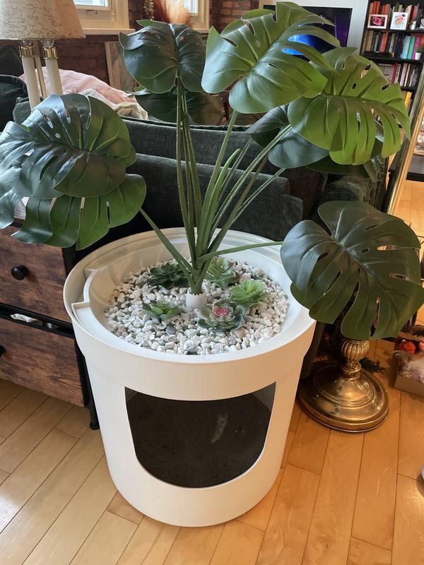 • Litter box comes with an artificial Monstera deliciosa plant that can be fluffed up with other decorative accessories (not included) for extra style points.