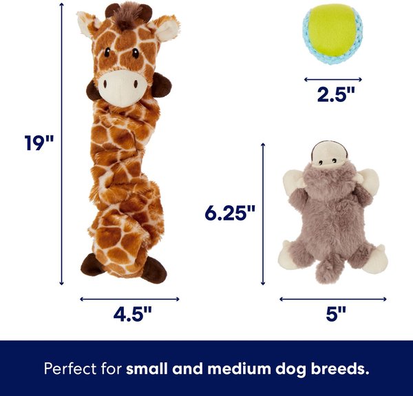 • This bundle of six toys is specially selected for small to medium dogs. Includes: one plush bungee giraffe, one plush squeaky monkey, two rope toys, one plush bone, and one plush, squeaky ball.