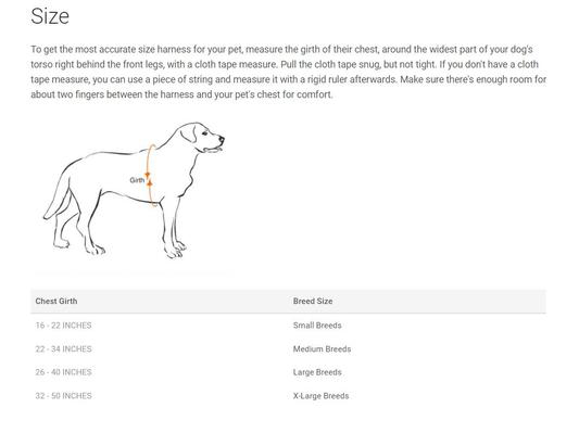 The sizing chart may be located by clicking the “Size” tab, on the product page. To select the best size we recommend that you measure your dog's chest girth (circumference). To measure the chest girth you'll measure around the broadest part of the rib-cage behind the front legs. If the dog happens to be in between sizes, it's then recommended to select the bigger size.