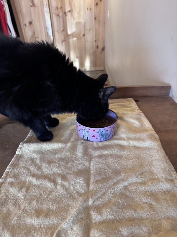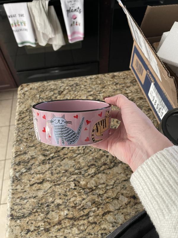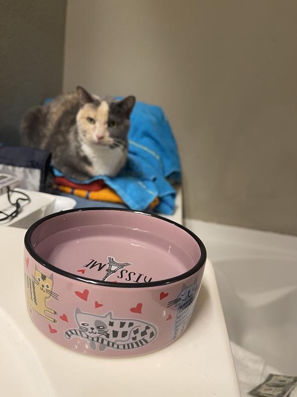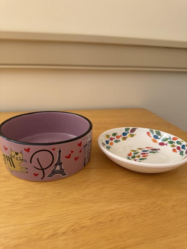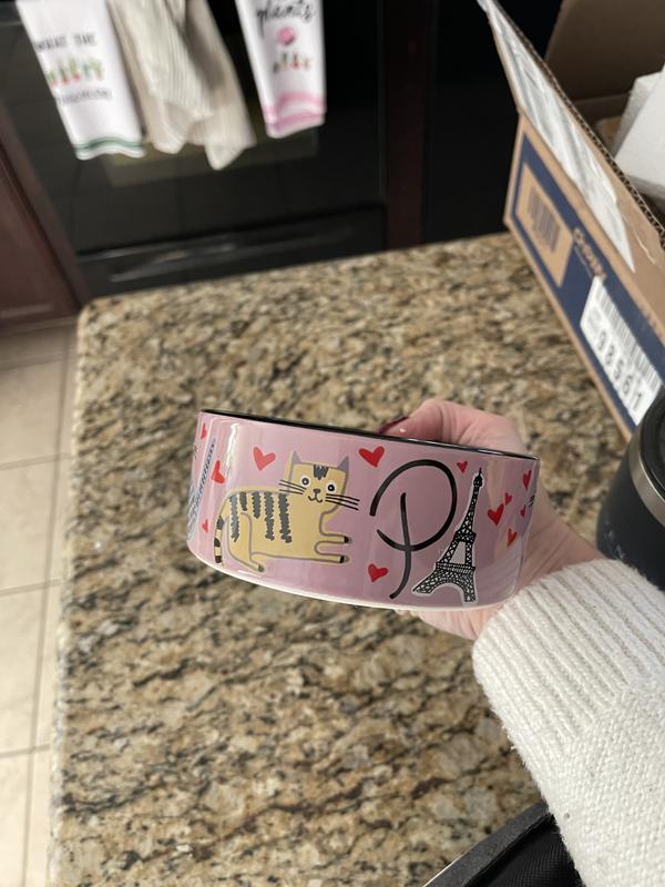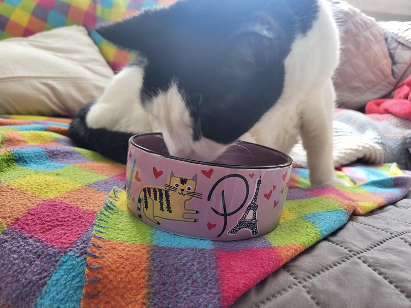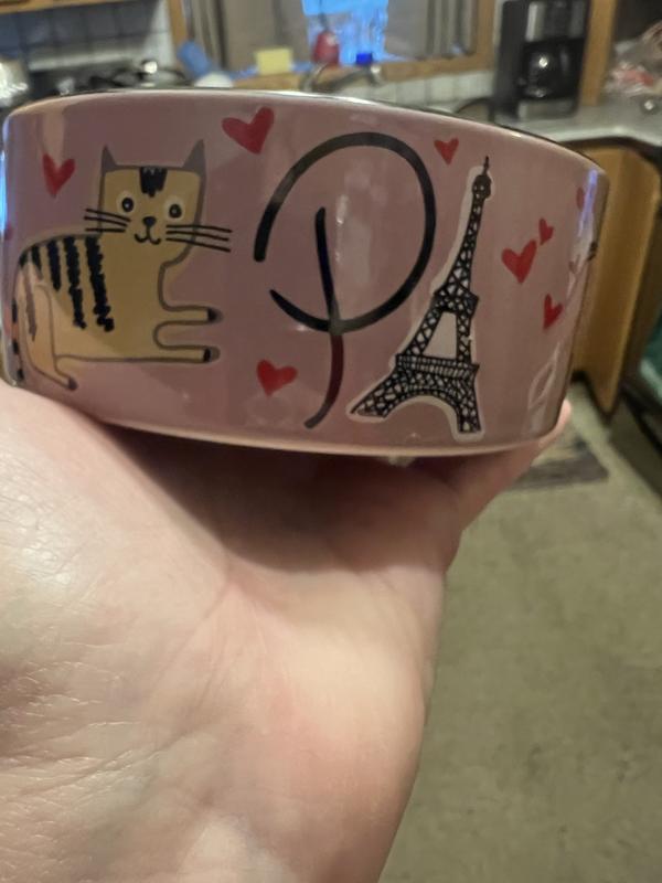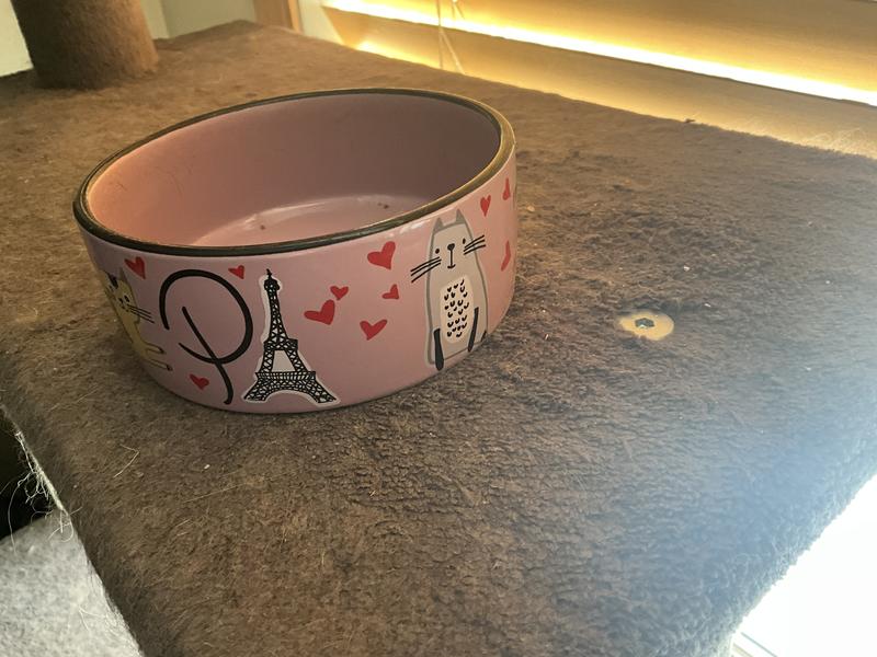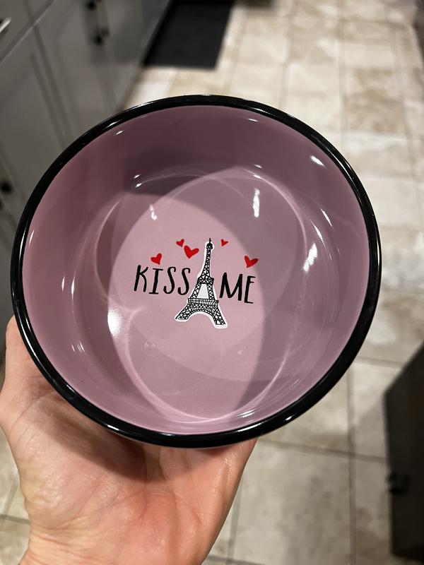 [This review was collected as part of a promotion.] This cat bowl is the cutest thing ever!! I probably love it more than my cats. However, they love that it is non skidding and doesn’t move all over when eating out of it. It is very well made. I dropped it on carpet and it did not chip or break. I am ordering another one so both my cats can have matching bowls. When the food is gone you get this cute picture of the Eiffel Tower with little hearts that says “kiss me.” Just a super cute bowl!!