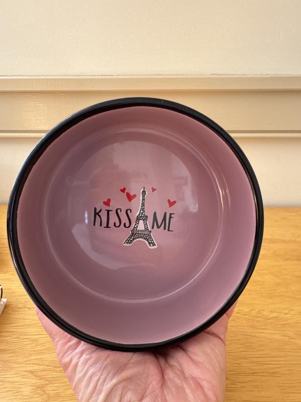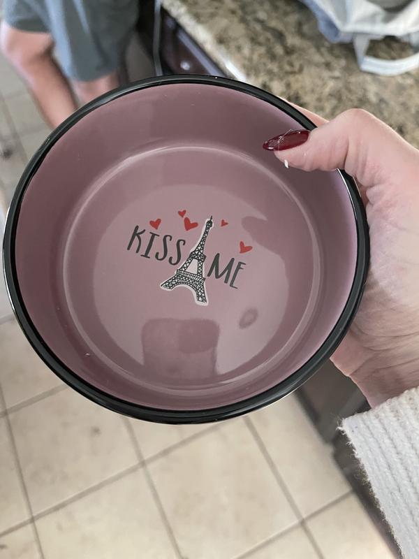 • Soft purple ceramic cat dish with a distinctive Paris-themed design outside and "kiss me" graphic inside.