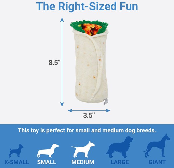 My dog absolutely loved this burrito toy and it was also really entertaining to watch her carry it around. She's a medium-sized dog and loves plush toys with squeakers in them. I gave it the 4 star rating instead of a 5 just for how easily she popped the squeaker in this toy.