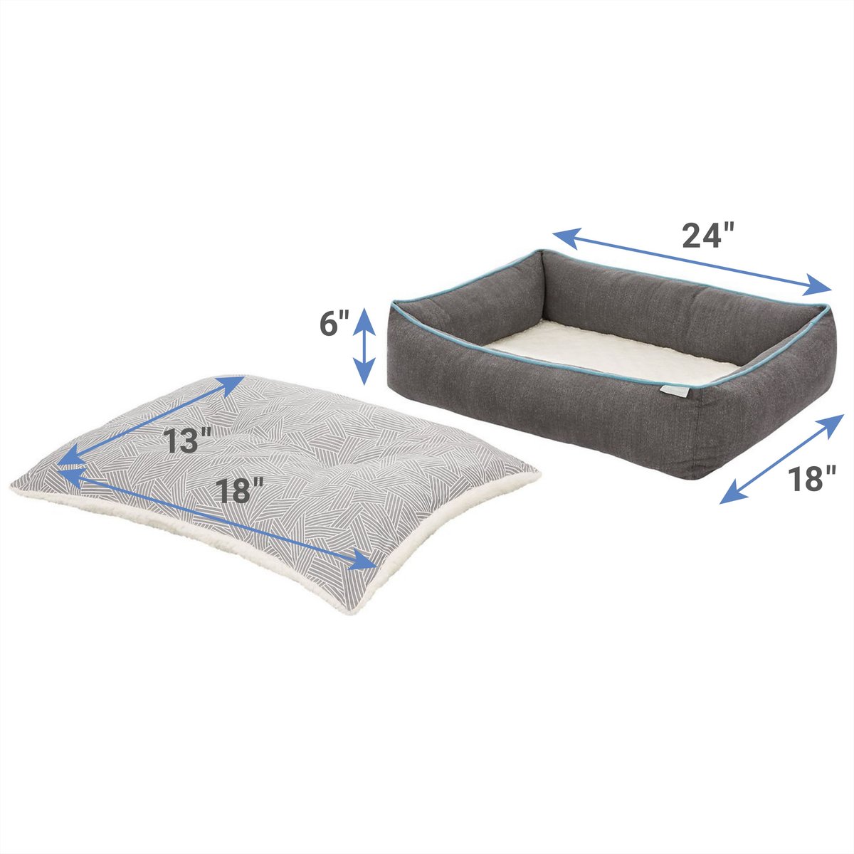 • Two-piece, rectangular-shaped pet bed made with a removable cushion. This double-sided cushion has a polyester-fibre filling with soft, cloud Sherpa on one side and a geometric twill print on the other.