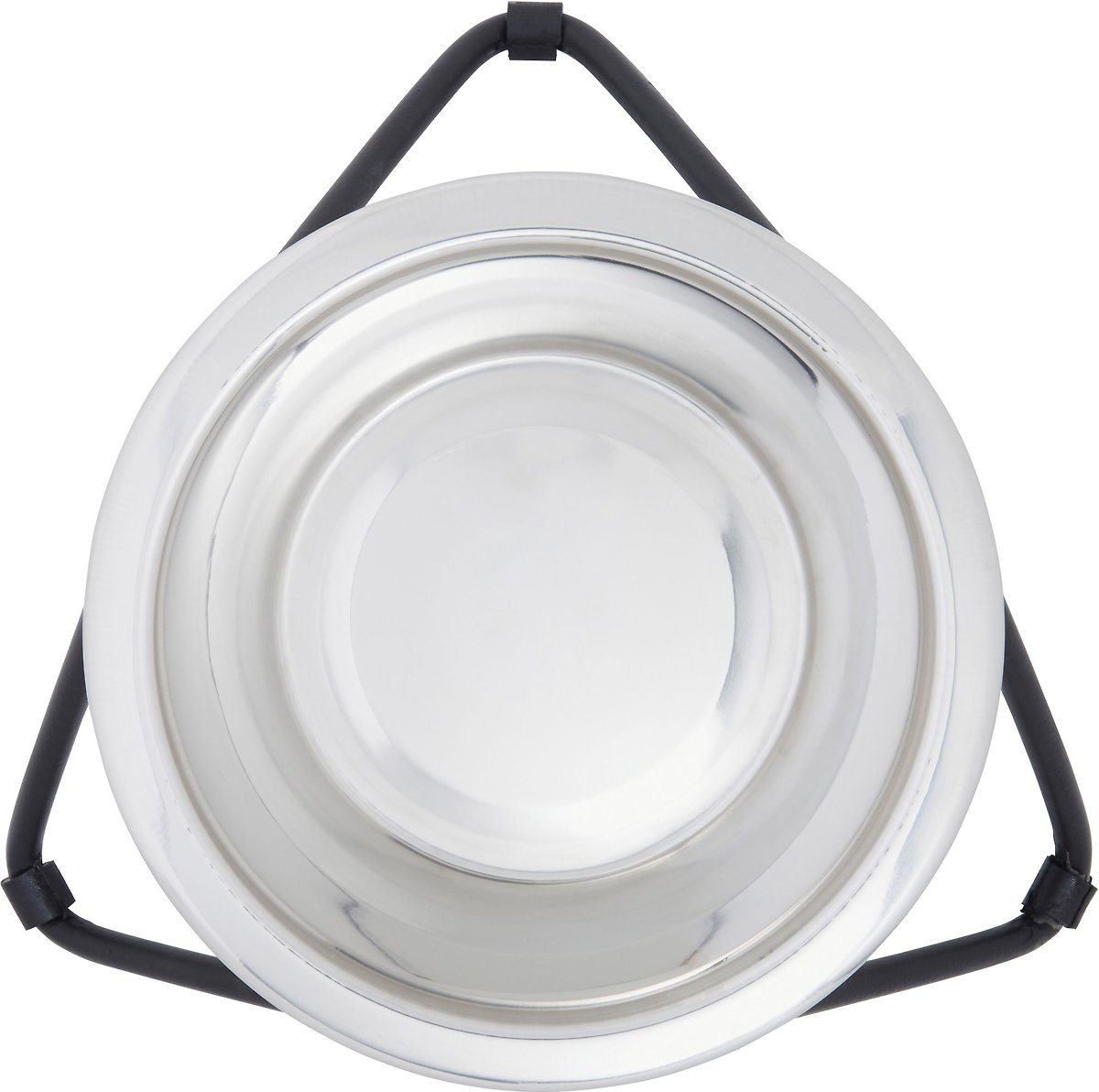 • Stylish triangle iron stand holds stainless steel bowl snugly.