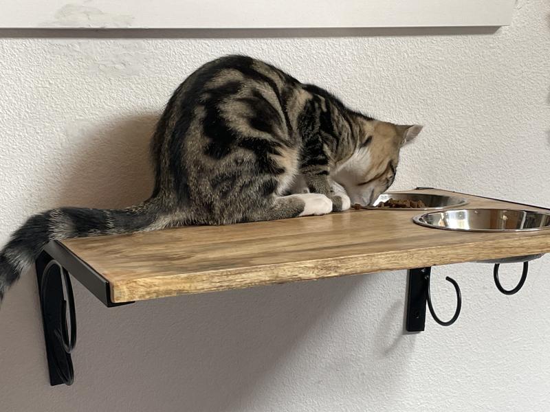 • Natural wood look with dark metal mounting brackets adds a little bit of style to your cat’s dinner table.
