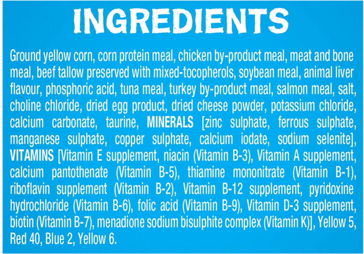 Ground Yellow Corn, Corn Gluten Meal, Chicken By-Product Meal, Meat And Bone Meal, Beef Tallow Preserved With Mixed-Tocopherols, Soybean Meal, Animal Liver Flavour, Phosphoric Acid, Salt, Tuna Meal, Turkey By-Product Meal, Salmon Meal, Calcium Carbonate, Potassium Chloride, Choline Chloride, Dried Cheese Powder, Dried Egg Product, Taurine, Minerals (Zinc Sulphate, Ferrous Sulphate, Manganese Sulphate, Copper Sulphate, Calcium Iodate, Sodium Selenite], Vitamins |Vitamin E Supplement, Niacin (Vitamin B-3), Vitamin A Supplement, Calcium Pantothenate (Vitamin B-5), Thiamine Mononitrate (Vitamin B-1), Riboflavin Supplement (Vitamin B-2), Vitamin B-12 Supplement, Pyridoxine Hydrochloride (Vitamin B-6), Folic Acid (Vitamin B-9), Vitamin D-3 Supplement, Biotin (Vitamin B-7), Menadione Sodium Bisulfite Complex (Vitamin K)], Red 40, Yellow 5, Blue 2, Yellow 6. M600017C.