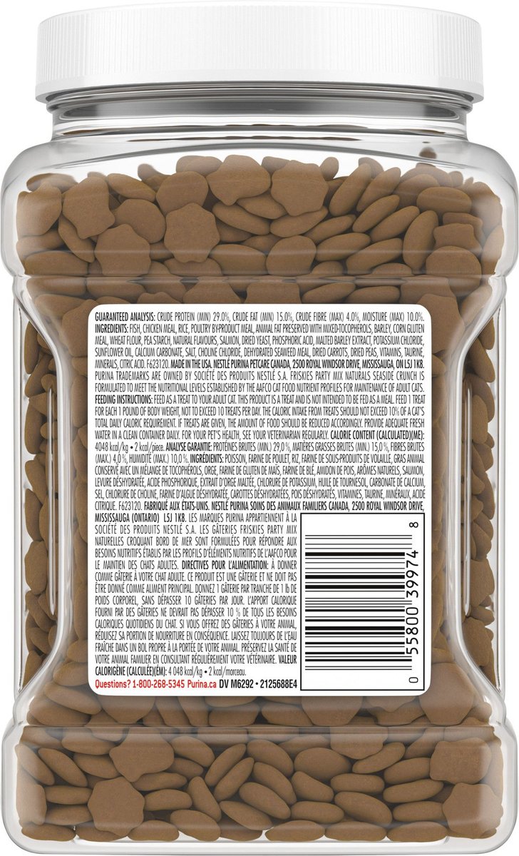 - Friskies Party Mix Naturals Seaside Crunch is made with real salmon.