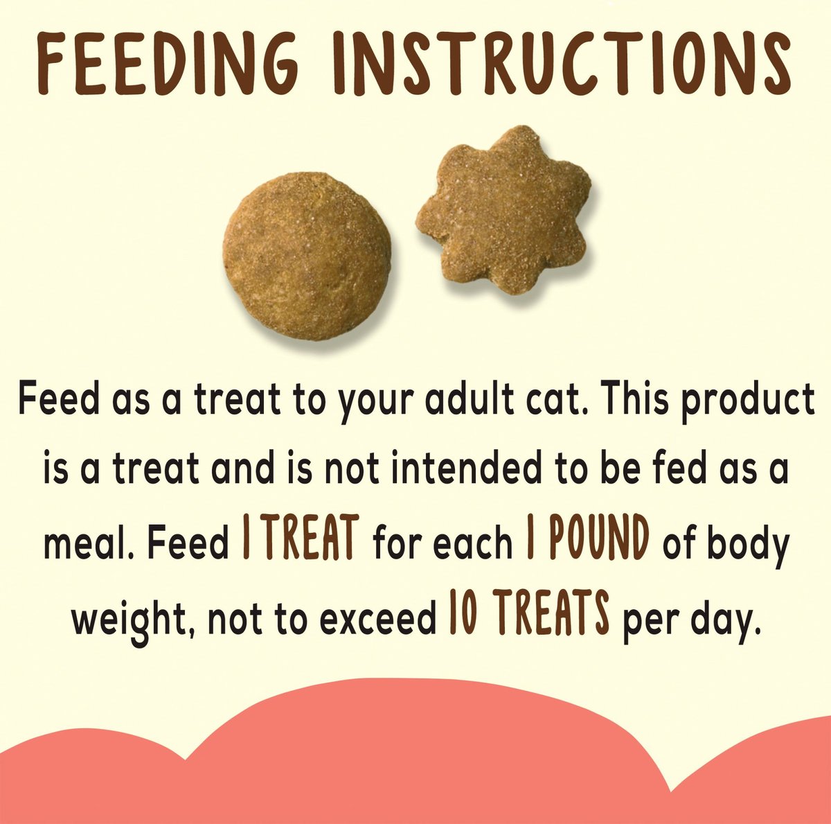 Feed as a treat to your adult cat. This product is a treat and is not intended to be fed as a meal. Feed 1 treat for each 1 pound of body weight, not to exceed 10 treats per day. The caloric intake from treats should not exceed 10% of a cat's total daily caloric requirement. If treats are given, the amount of food should be reduced accordingly. Provide adequate fresh water in a clean container daily. For your pet's health, see your veterinarian regularly.