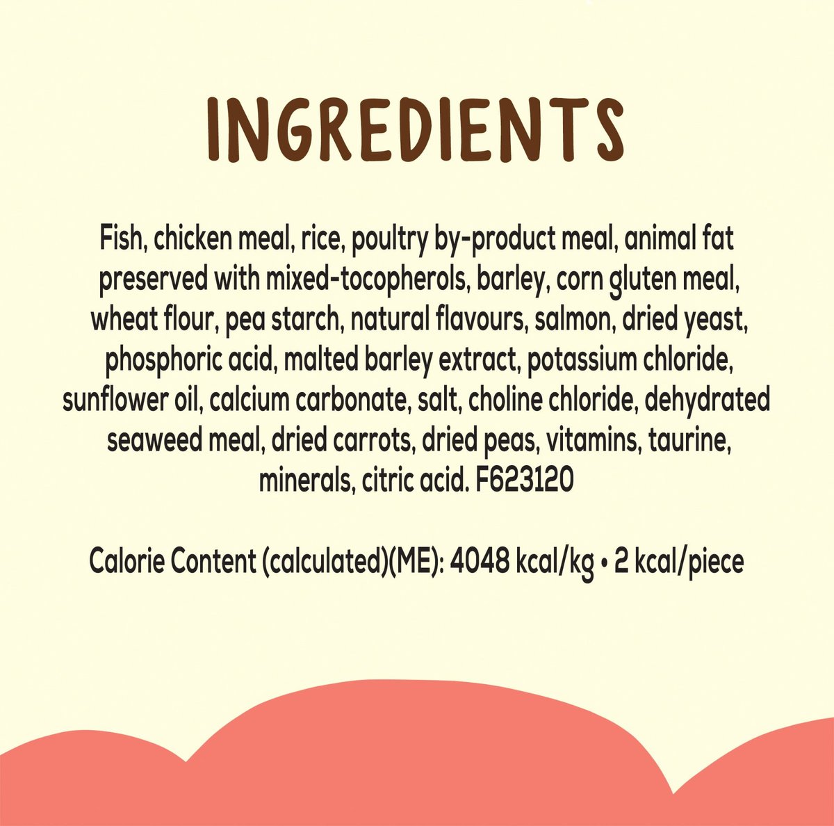 Fish, Chicken Meal, Rice, Poultry By-Product Meal, Animal Fat Preserved with Mixed-Tocopherols, Barley, Corn Gluten Meal, Wheat Flour, Pea Starch, Natural Flavours, Salmon, Dried Yeast, Phosphoric Acid, Malted Barley Extract, Potassium Chloride, Sunflower Oil, Calcium Carbonate, Salt, Choline Chloride, Dehydrated Seaweed Meal, Dried Carrots, Dried Peas, Vitamins, Taurine, Minerals, Citric Acid. F623120. F623120