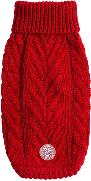 This is a very well made nice fitting sweater for my little schitzu jazzy loves her sweater, keeps her nice & warm. It fits nicely goes all the way down her back & a nice turtleneck cuff @ the neck to keep her warm. I bought small she is 13lbs & fits perfectly & the color red is perfect for Christmas
