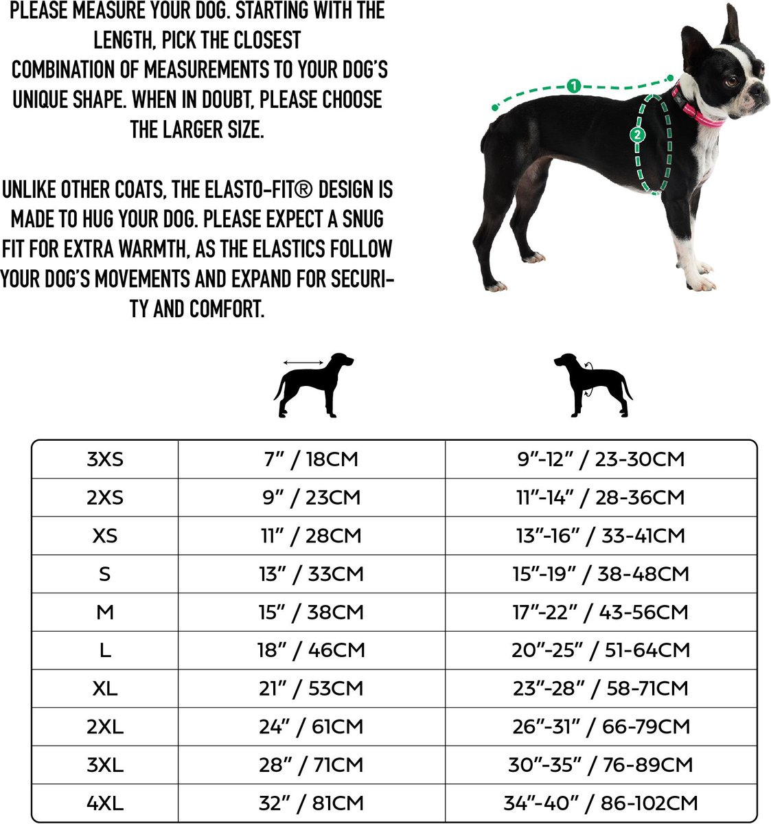 The raincoats feature ELASTO-FIT® technology, which is designed to provide a snug and comfortable fit for dogs of various sizes. To ensure the best fit, we recommend measuring your dog with a soft measuring tape while they are standing. This will give you the most accurate measurements for both chest girth (around their body at the widest point) and back length (be sure to not include any of their neck or tail in this measurement; start just below their collar to the base of their tail).