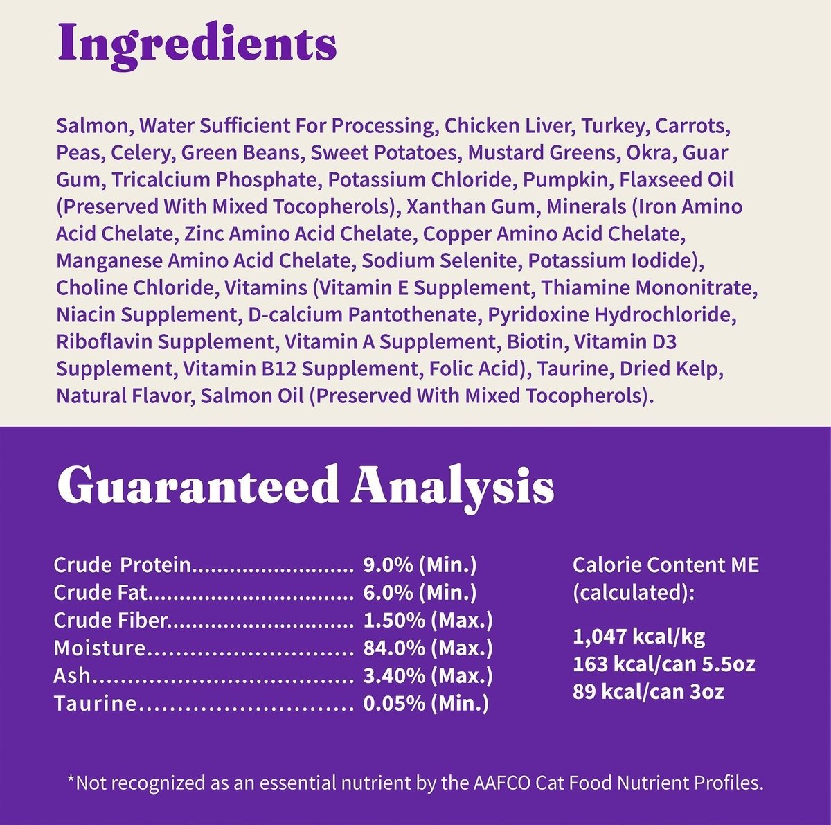 Salmon, Water Sufficient For Processing, Chicken Liver, Turkey, Carrots, Peas, Celery, Green Beans, Sweet Potatoes, Mustard Greens, Okra, Guar Gum, Tricalcium Phosphate, Potassium Chloride, Pumpkin, Flaxseed Oil (Preserved With Mixed Tocopherols), Xanthan Gum, Minerals (Iron Amino Acid Chelate, Zinc Amino Acid Chelate, Copper Amino Acid Chelate, Manganese Amino Acid Chelate, Sodium Selenite, Potassium Iodide), Choline Chloride, Vitamins (Vitamin E Supplement, Thiamine Mononitrate, Niacin Supplement, D-Calcium Pantothenate, Pyridoxine Hydrochloride, Riboflavin Supplement, Vitamin A Supplement, Biotin, Vitamin D3 Supplement, Vitamin B12 Supplement, Folic Acid), Taurine, Dried Kelp, Natural Flavor, Salmon Oil (Preserved With Mixed Tocopherols).
