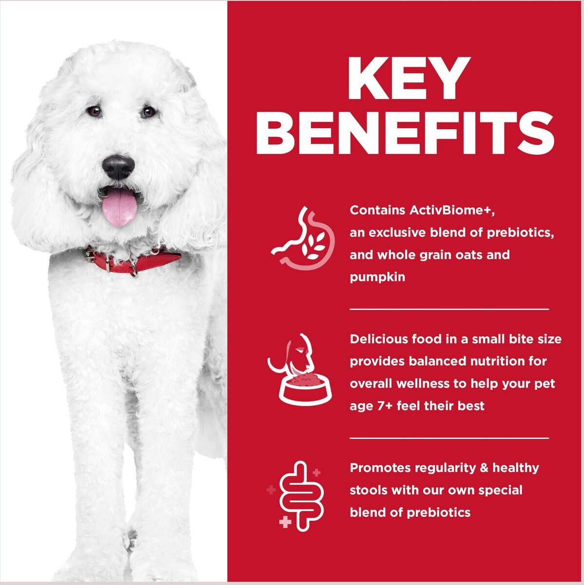 - Aids in cultivating a healthy microbiome and overall digestive well-being in dogs over age 7.