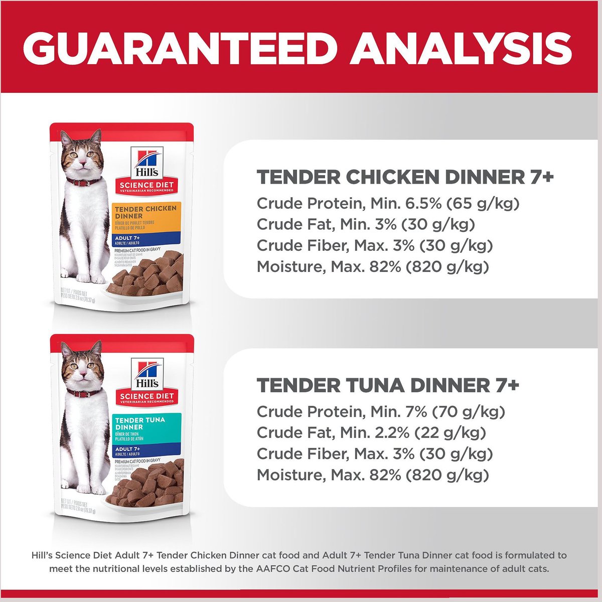 Our 14 year old cat is difficult to feed but this food has turned out to be the best. It's the perfect mix of moisture and softness. She now has a better appetite and always eats ALL of her portion. It will probably prolong her life as a result! Highly recommend it for older cats. Hill's Science Diet is what we use both in tender dinner and dry food
