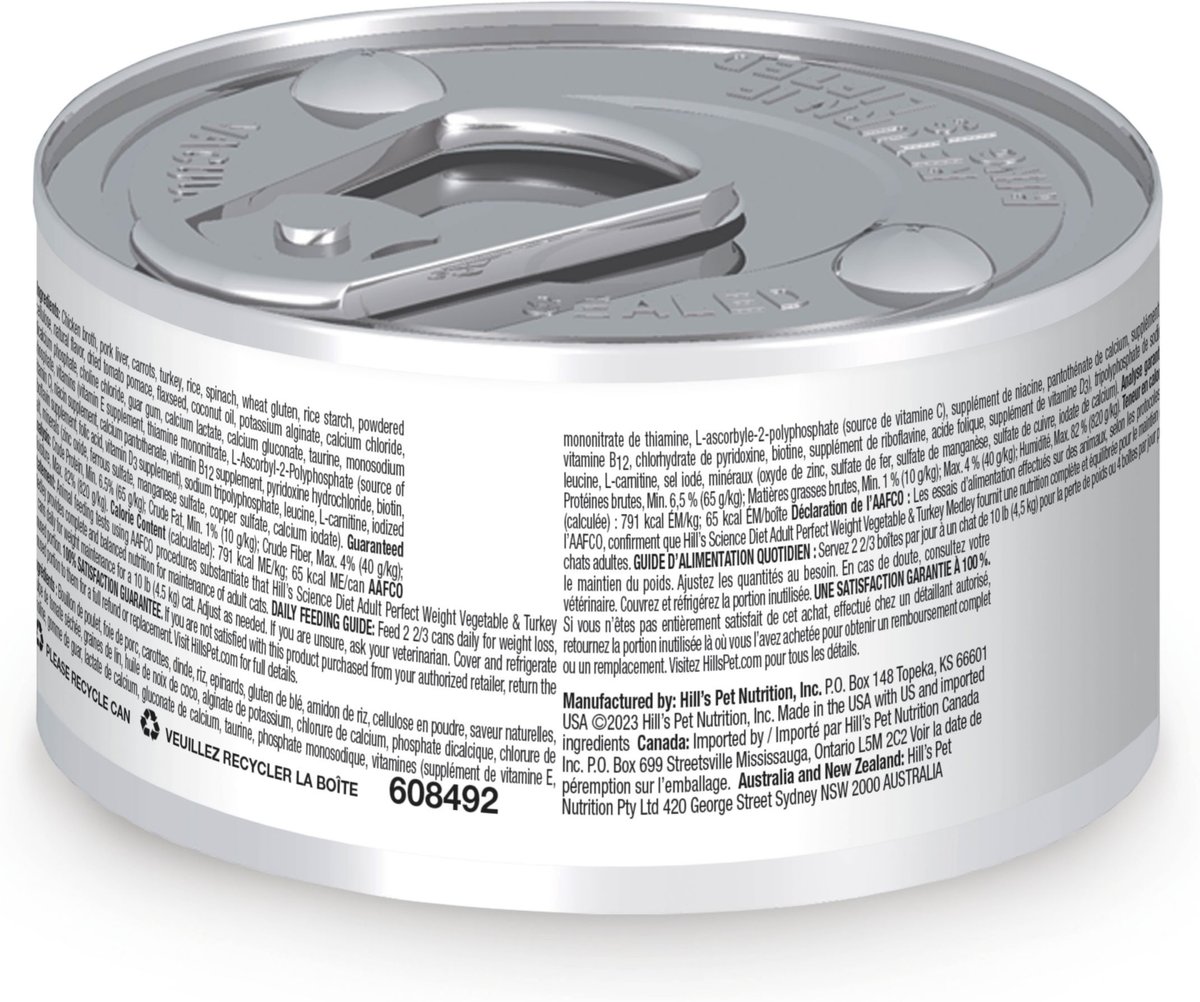 Hill's Science Diet Adult Perfect Weight Vegetable & Turkey Medley Canned Cat Food, 82-g can, case of 24