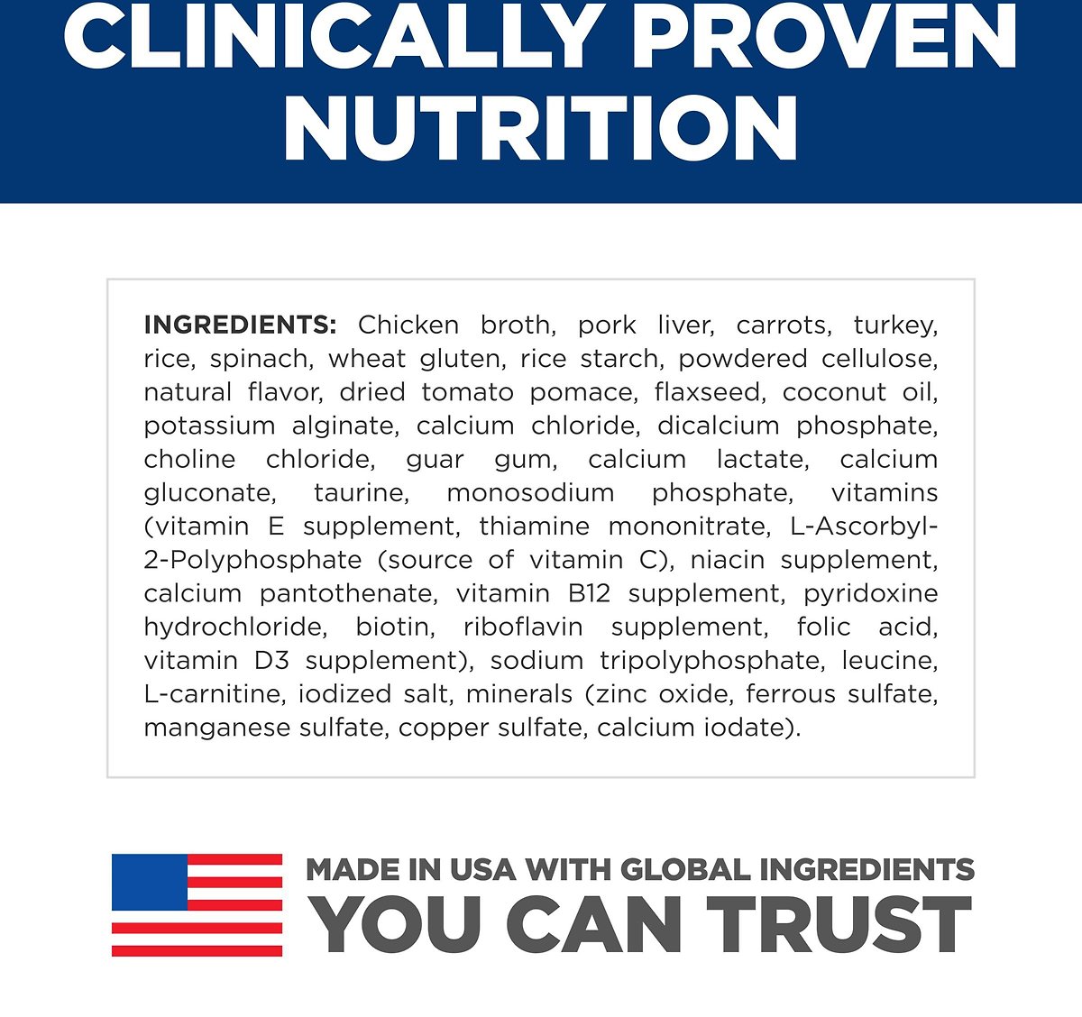 Chicken Broth, Pork Liver, Carrots, Turkey, Rice, Spinach, Wheat Gluten, Rice Starch, Powdered Cellulose, Natural Flavor, Dried Tomato Pomace, Flaxseed, Coconut Oil, Potassium Alginate, Calcium Chloride, Dicalcium Phosphate, Choline Chloride, Guar Gum, Calcium Lactate, Calcium Gluconate, Taurine, Monosodium Phosphate, vitamins (Vitamin E Supplement, Thiamine Mononitrate, L-Ascorbyl-2-Polyphosphate (source of Vitamin C), Niacin Supplement, Calcium Pantothenate, Vitamin B12 Supplement, Pyridoxine Hydrochloride, Biotin, Riboflavin Supplement, Folic Acid, Vitamin D3 Supplement), Sodium Tripolyphosphate, Leucine, L-Carnitine, Iodized Salt, minerals (Zinc Oxide, Ferrous Sulfate, Manganese Sulfate, Copper Sulfate, Calcium Iodate).