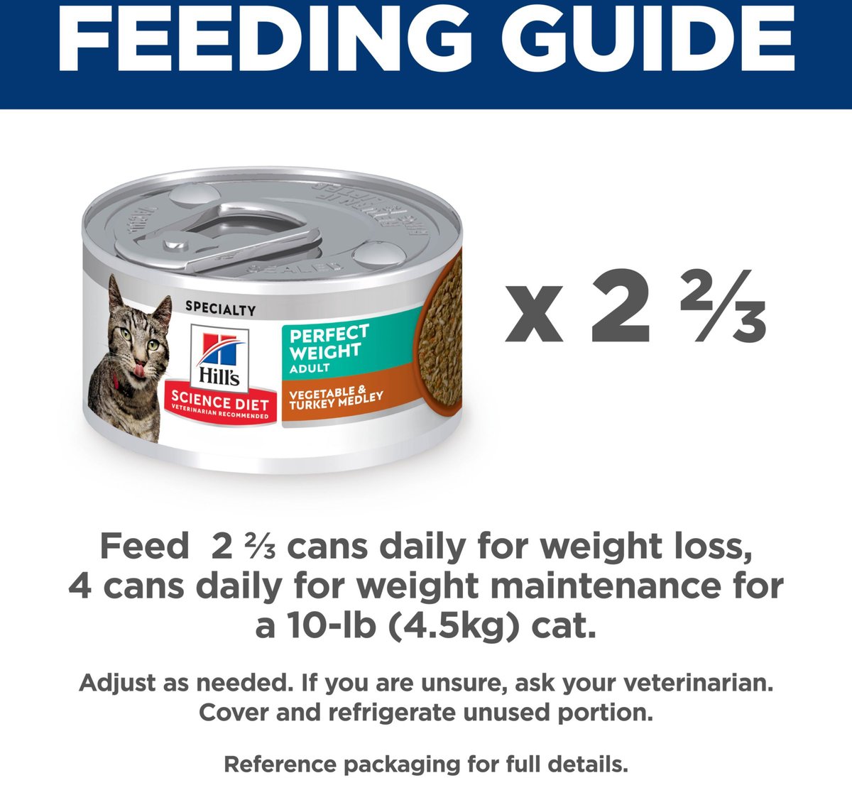 Feed 2/3 cans daily for weight loss, 4 cans daily for weight maintenance for a 4.5-kg cat.