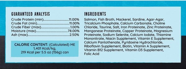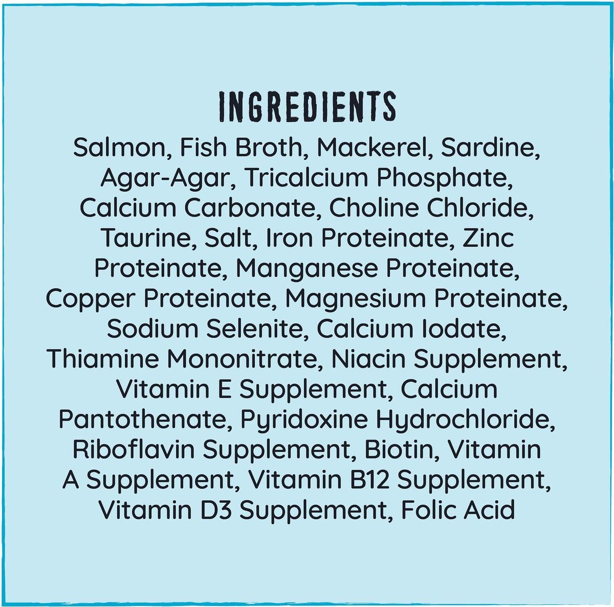 Salmon, Fish Broth, Mackerel, Sardine, Agar-Agar, Tricalcium Phosphate, Calcium Carbonate, Choline Chloride, Taurine, Salt, Iron Proteinate, Zinc Proteinate, Manganese Proteinate, Copper Proteinate, Magnesium Proteinate, Sodium Selenite, Calcium Iodate, Thiamine Mononitrate, Niacin Supplement, Vitamin E Supplement, Calcium Pantothenate, Pyridoxine Hydrochloride, Riboflavin Supplement, Biotin, Vitamin A Supplement, Vitamin B12 Supplement, Vitamin D3 Supplement, Folic Acid.