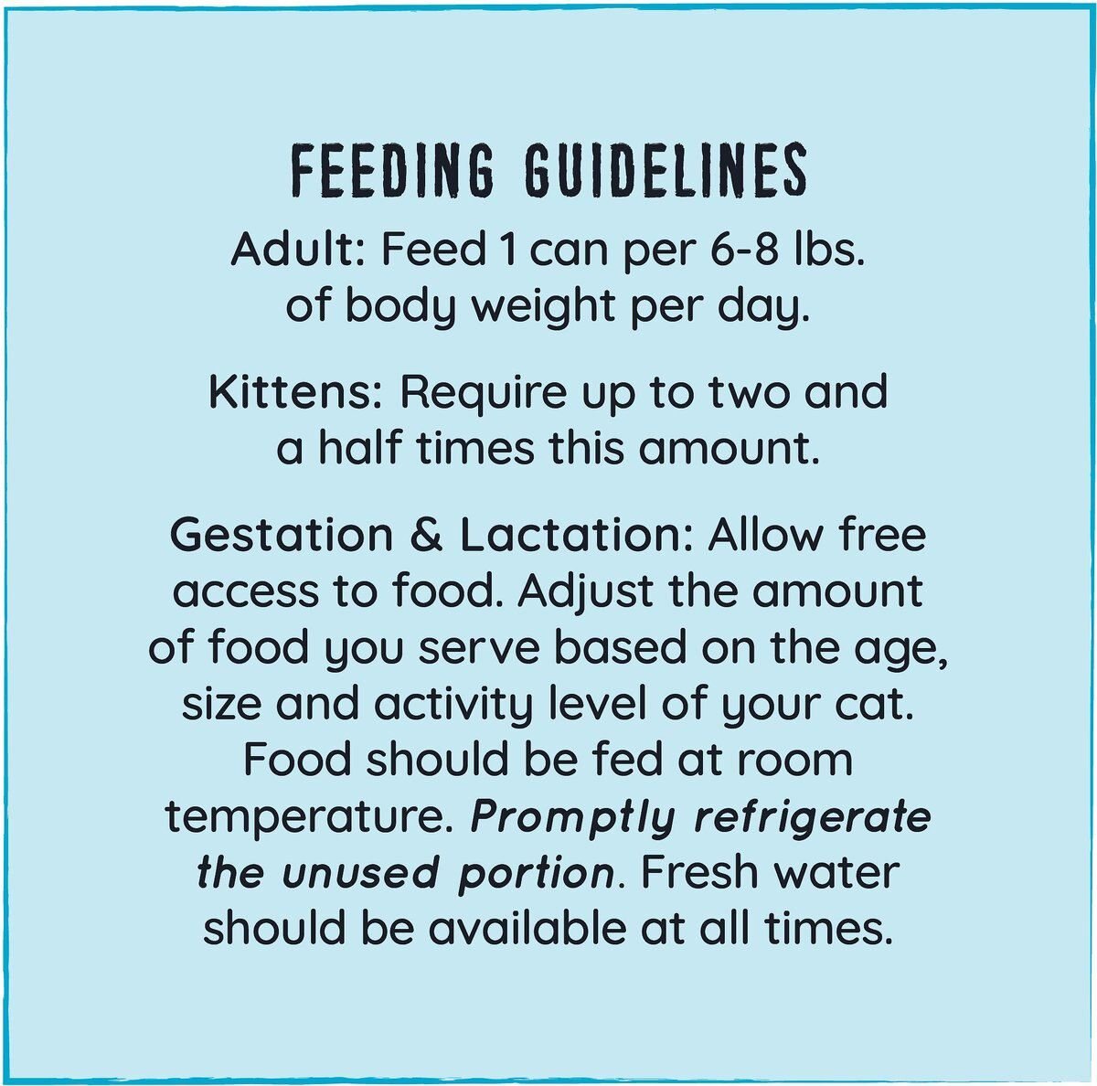For Adult cats, feed 1 can per 6 - 8 lbs of body weight per day. Kittens require up to 2 1/2 times this amount. For pregnant and lactating females, allow free access to food. Adjust the amount of food you serve based on the age, size and activity level of your cat. Food should be fed at room temperature.