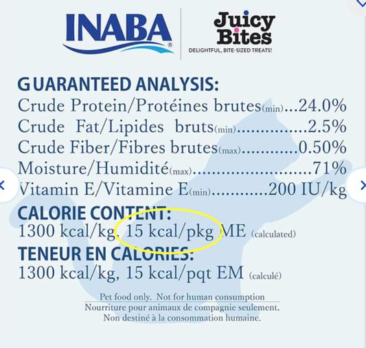 15 kcal per treat sounded rather high as a whole tube of Churu is only 6 kcal, so I looked for nutritional info in the photos Chewy provided above and found this: 15 kcal/package