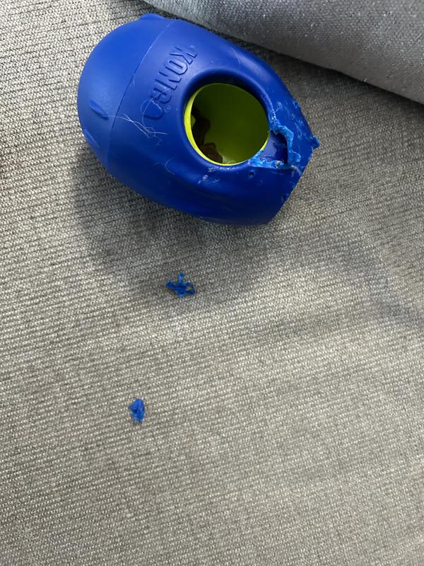 We own three of these: 2 large, and one small that we used for our puppy. I don’t understand the negative reviews. They must not be supervising their dog for their dog to be tearing this up. I have 2 large highly food motivated dogs. Neither have destroyed their toy. One toy we have owned since 2019 and the other since 2022. They all have scratch marks from their claws but no cracks of any kind. My dogs push them around the house to get their food. Once they’re finished, I pick the toy up so they cannot have access to it. My one dog has learned that there is a very short time where no treats will come out despite pushing it around. That’s where she takes a slight break, then goes back to resume. My younger dog just keeps pushing it around the house until the food comes out. Neither has ever tried to break into it or bite it. I read in another review that a Yorkie’s mouth got stuck on it so maybe this toy is just not suitable for very small dogs like that.