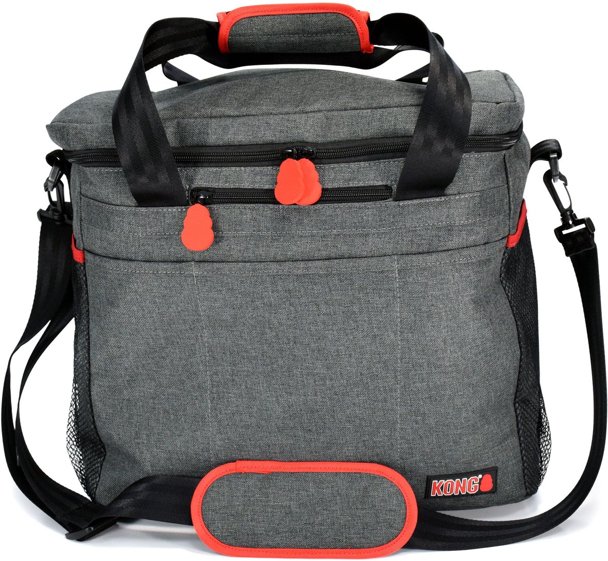 This bag comes with 2 food grade storage containers, and 2 food grade foldable travel bowls. It does have a handle to slide over luggage to attach securely.