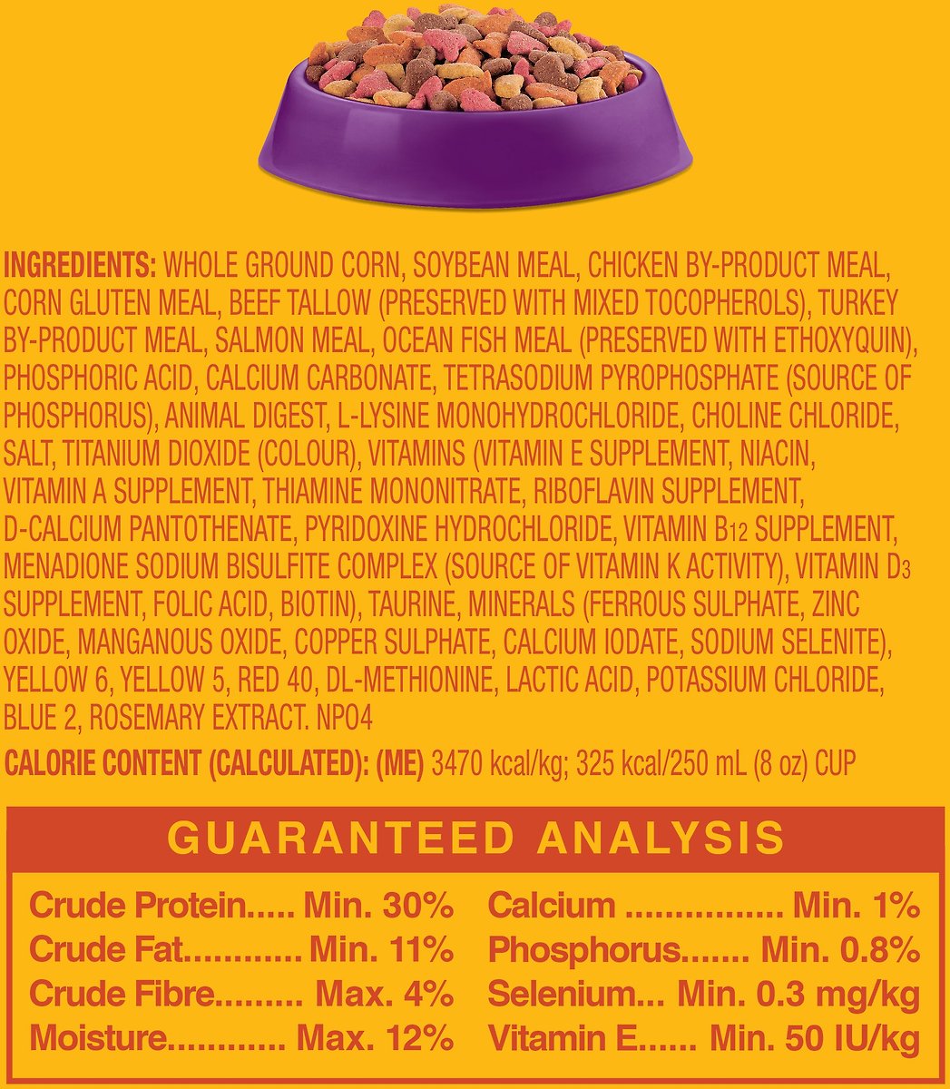 Whole Ground Corn, Soybean Meal, Chicken By-Product Meal, Corn Gluten Meal, Beef Tallow (Preserved With Mixed Tocopherols), Animal Digest, Turkey By-Product Meal, Salmon Meal, Oceanfish Meal, Phosporic Acid, Calcium Carbonate, L-Lysine Monohydrochloride, Choline Chloride, Salt, Titanium Dioxide (Colour), Vitamins (Vitamin E Supplement, Niacin, Vitamin A Supplement, Thiamine Mononitrate, Riboflavin Supplement, D-Calcium Pantothenate, Pyridoxine Hydrochloride, Vitamin B12 Supplement, Menadione Sodium Bisulfite Complex (Source Of Vitamin K Activity), Vitamin D3 Supplement, Folic Acid, Biotin), Minerals (Ferrous Sulfate, Zinc Oxide, Manganous Oxide, Copper Sulfate, Calcium Iodate, Sodium Selenite), Taurine, Dl-Methionine, Yellow 6, Yellow 5, Lactic Acid, Red 40, Potassium Chloride, Blue 2, Rosemary Extract.