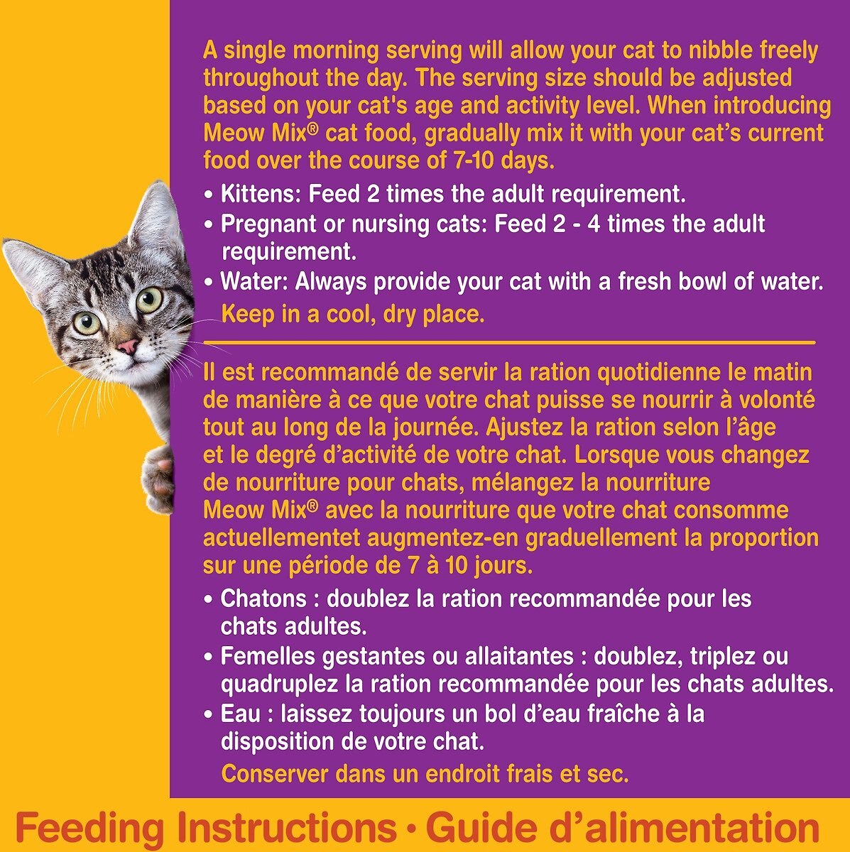 When introducing Meow Mix cat food, gradually mix it with your cat's current food over the course of 7-10 days.
