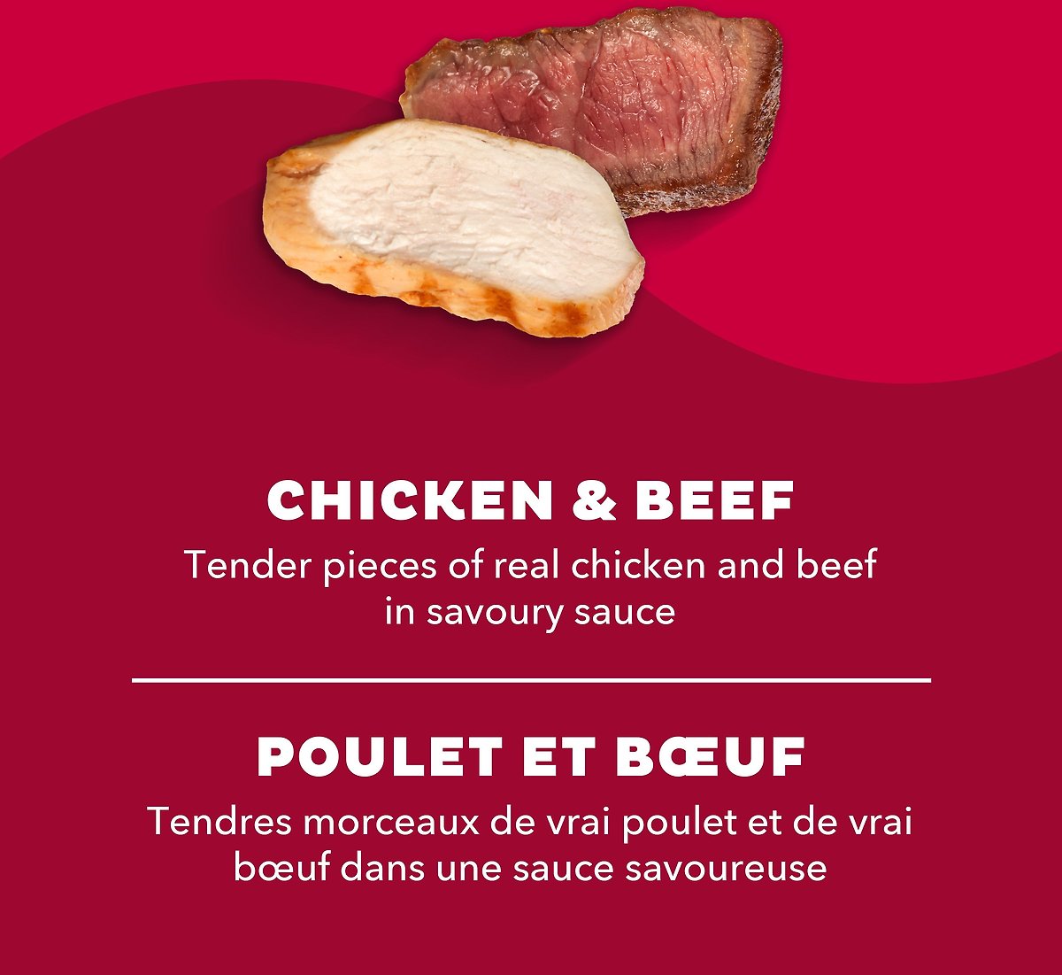 • Tender pieces of real chicken and beef are served up in a savoury sauce.