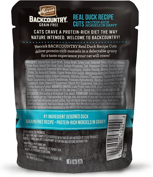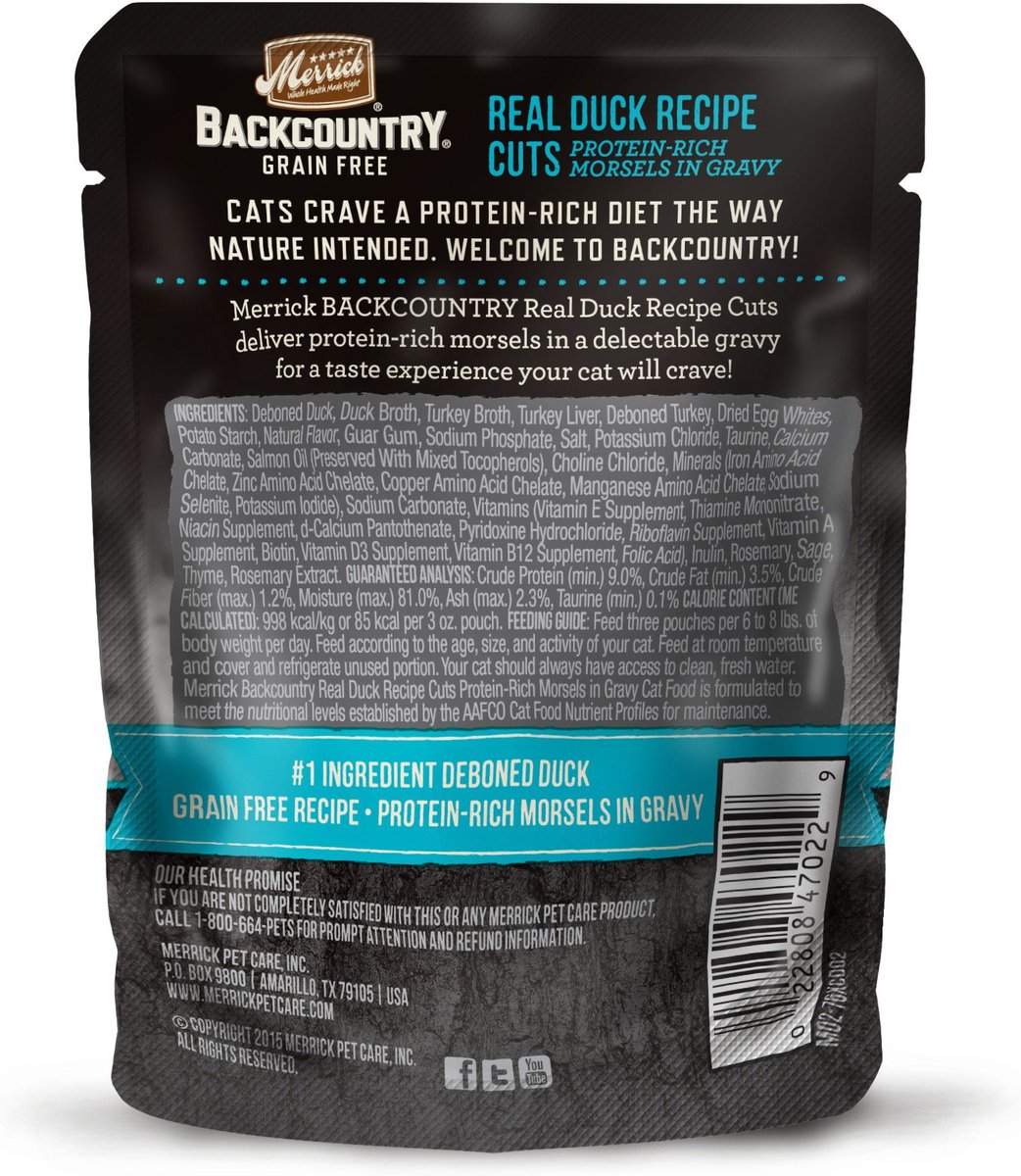 I've got two kittens who eat a combination of kitten and "all life stages" wet food, for variety. I decided to try Merrick Backcountry with them to add another option to their rotation. From the first bite, they loved it. I have a hard time getting it into their bowls because they're climbing to the counter and trying to stick their faces right into the pouch! (For what it's worth, I don't love that it comes in a pouch and really hope Merrick starts selling this in cans.) This cat food smells like food, which I appreciate. Some other brands... phew. Not pleasant to a human's sniffer. It looks like small, meaty chunks, which is a texture my cats enjoy - they prefer shreds and chunks over pates. These chunks aren't too big for their little mouths, and they seem soft. I tried squishing one of the pouches before opening it and found that the chunks inside mashed down some without much pressure. And they're in a nice bit of gravy, which again, my cats really like. So this was right up their alley. I appreciate that the first few ingredients are all animal proteins or broth. No gluten or grains. I also appreciate that there's a bit of salmon oil included in the mix, for a boost of omega 3's. And this duck flavor doesn't contain chicken, but rather has turkey, which makes it helpful for keeping up with my kitties' preference for variety. If I give them the same food twice in a row, they make sure I know they aren't happy. So the mix here of duck and turkey keeps them from complaining that I give them too much chicken... :) All in all, my kitties are happy with this food, and so am I.